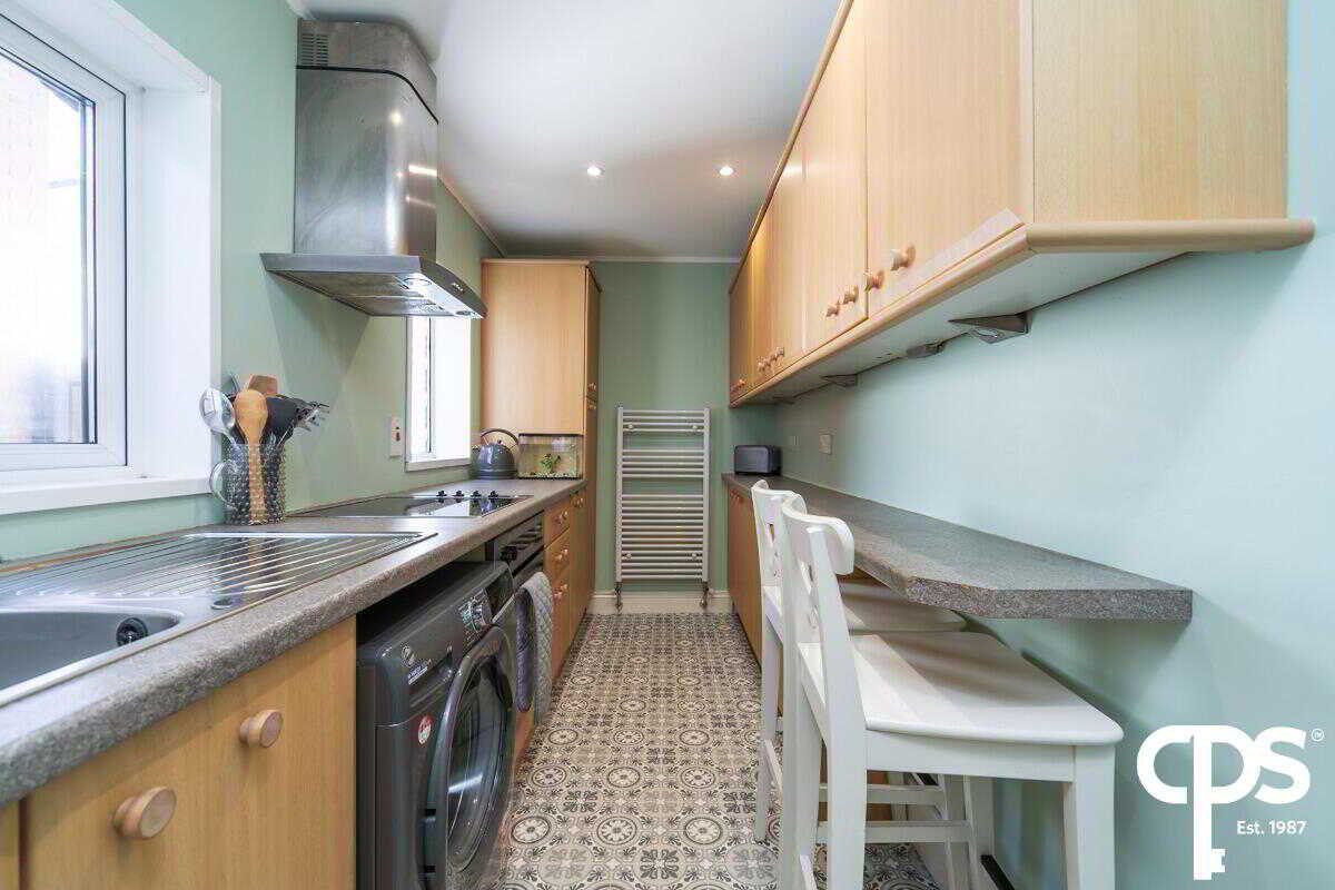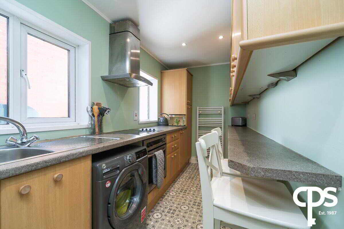 Formica worktops, range of high and low, stainless steel sink, vinyl flooring, towel radiator, single panelled radiator