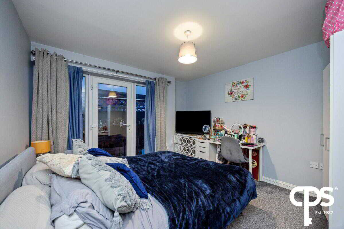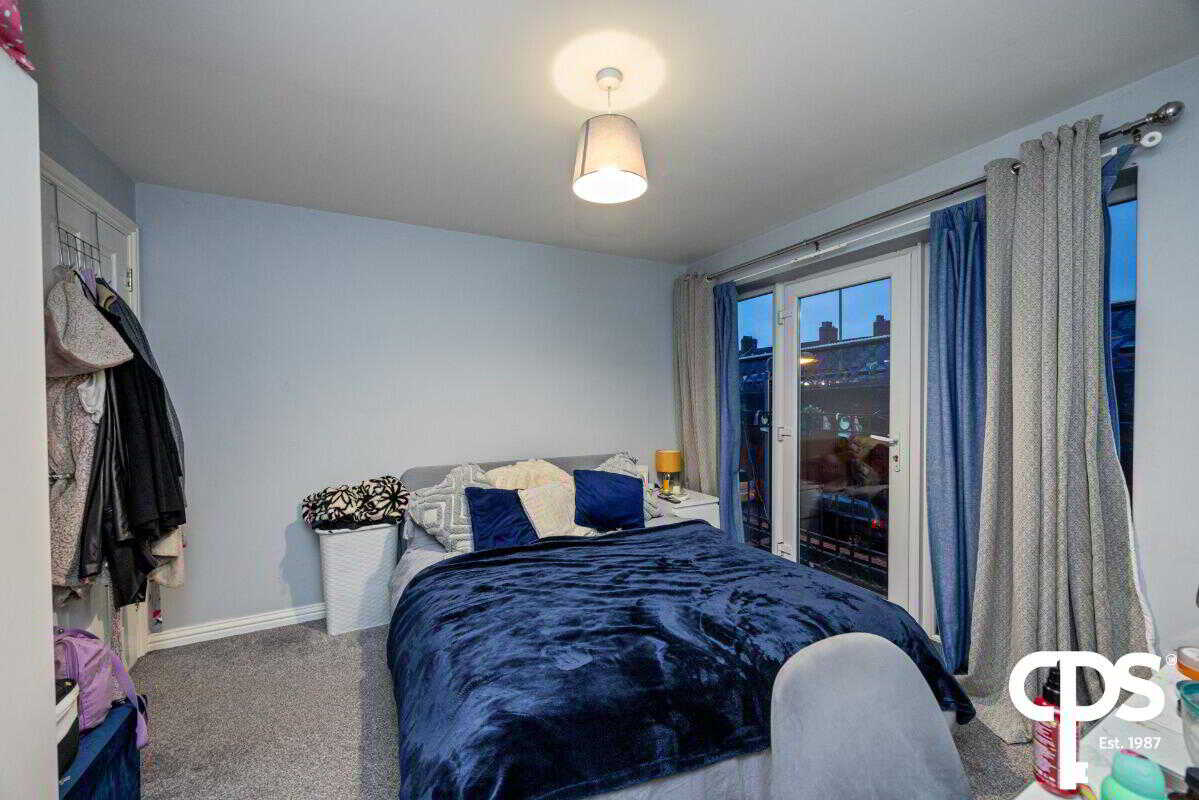 The main bedroom is a spacious double room finished with carpet flooring. This room features glass double doors, flooding the room with natural light and lead out onto a Juliet balcony.