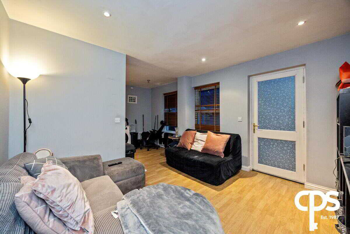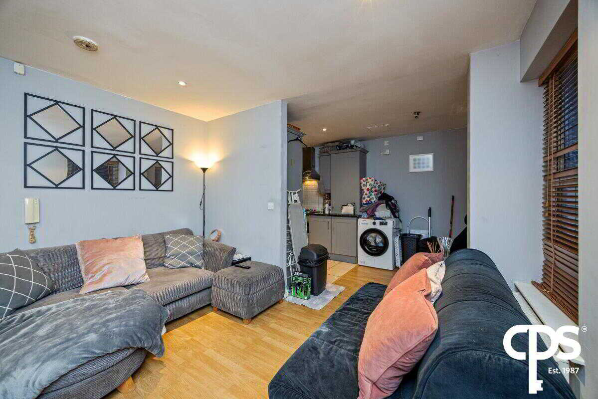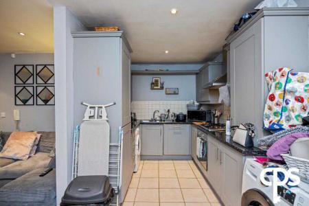The spacious, open plan living area is finished with neutral décor featuring laminate wooden flooring. The kitchen has units high and low with a tiled surround and tiled flooring. Kitchen appliances include an integrated oven with a four-ring gas hob.