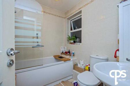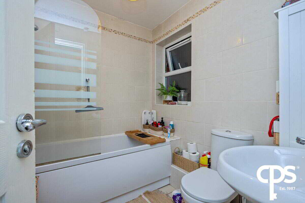 The fully tiled bathroom includes a three-piece suite with a bath and overhead shower.