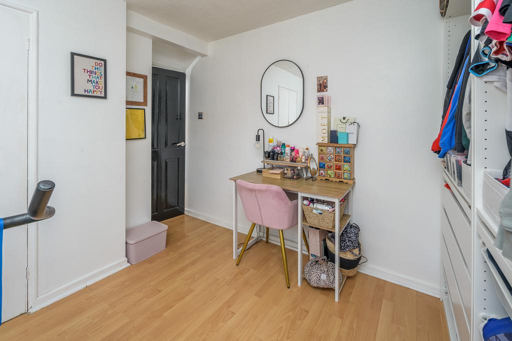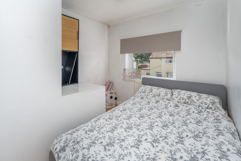 Bedroom 2 is a good-sized double with a window overlooking the rear garden. This light and bright room offers sizeable built-in storage which also houses the Ideal combi boiler for ease of access. The space has been finished with wood-effect laminate flooring.