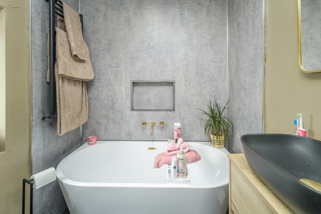 The family bathroom has been well planned to maximise the available space. There is a large black slim line shower tray with a pivot door with a brushed gold-coloured water fall shower head and a separate shower head within. The controls are mounted on a backing plate, the colour matching that of the shower fittings, which creates continuity in effect and works in harmony with the black ceramics. There is a black close coupled toilet with a gold-coloured push button behind, a double ended white bath with wall mounted cold-coloured taps, a black towel rail, an extractor fan and a wood-effect wall mounted vanity unit with a black hand wash basin and a mirror on top and two drawers beneath. A window allows for natural light and mottled grey cement look wet walling completes the spaces within the shower and around the bath and black vinyl furnishes the floor.