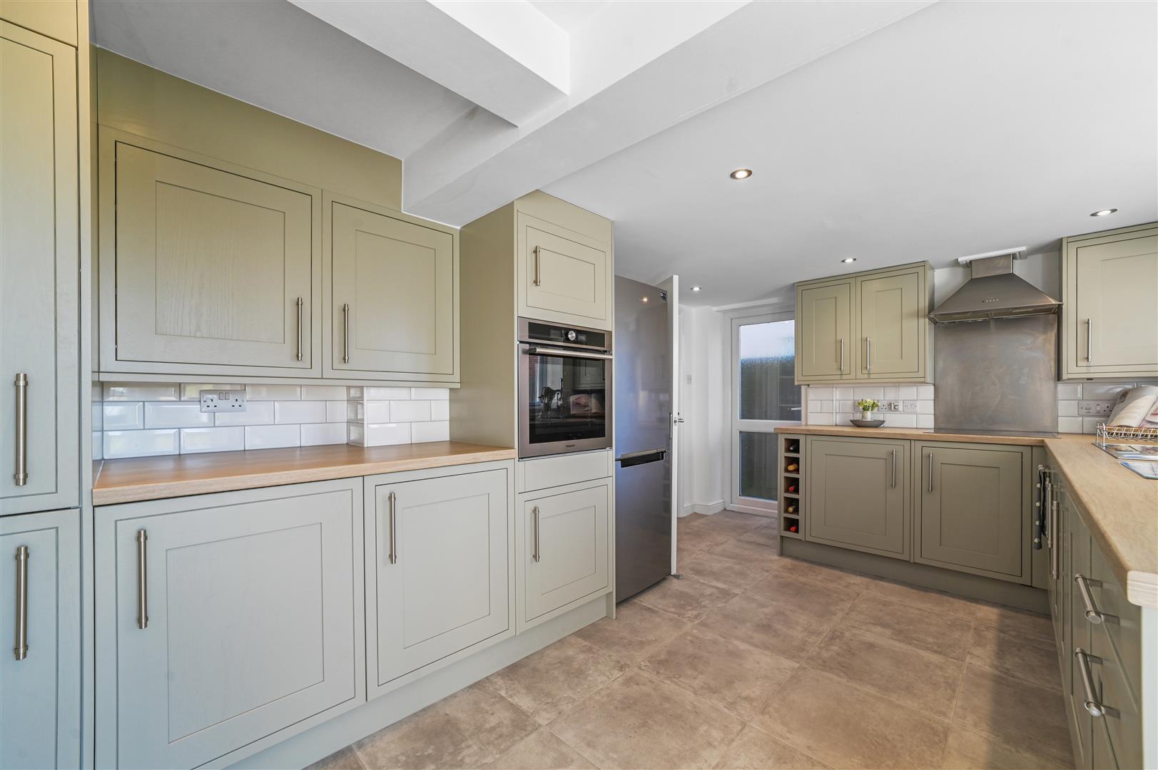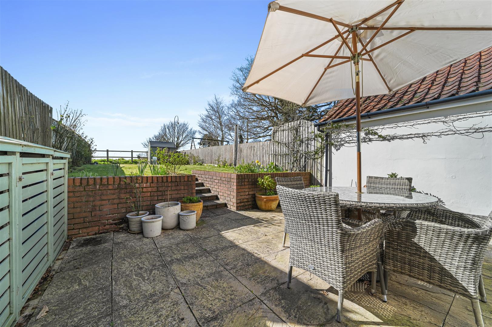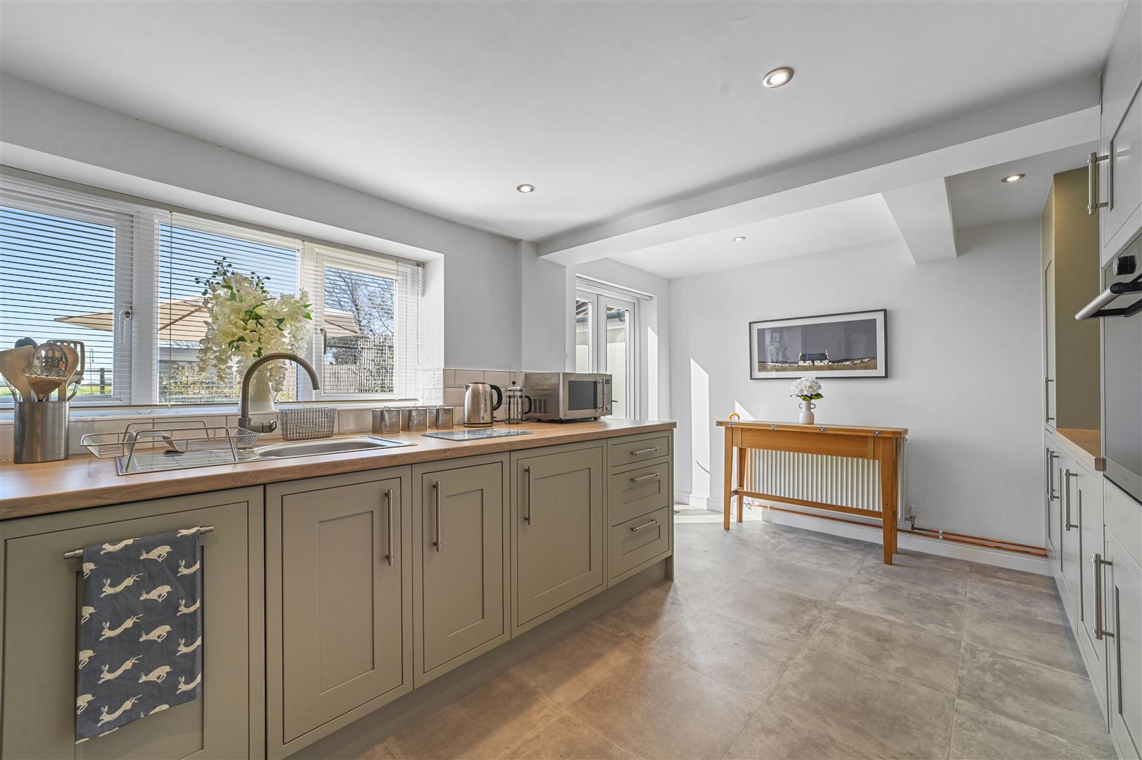The heart of the home is the kitchen, thoughtfully refitted around three years ago. It showcases classic shaker-style units complemented by warm wooden worktops, creating a timeless cottage feel. Double doors open out to the enclosed rear garden, seamlessly blending indoor and outdoor living. The garden itself offers a patio area ideal for alfresco dining, a well-kept lawn, and delightful views across open farmland.