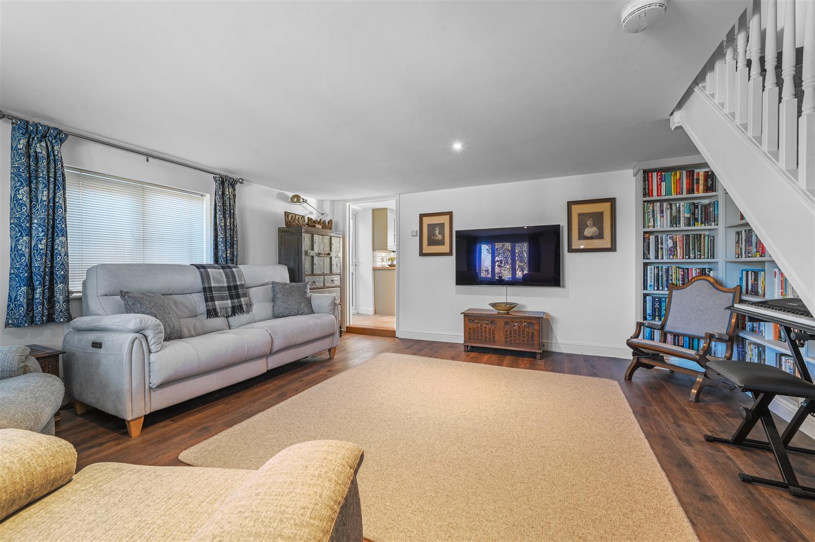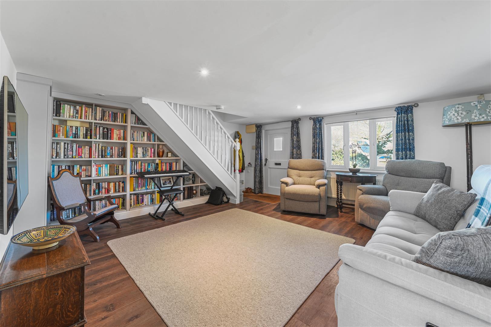 Upon entering, you are welcomed into a cosy living room featuring bespoke-style bookcases neatly set beneath the staircase, adding both charm and useful storage.