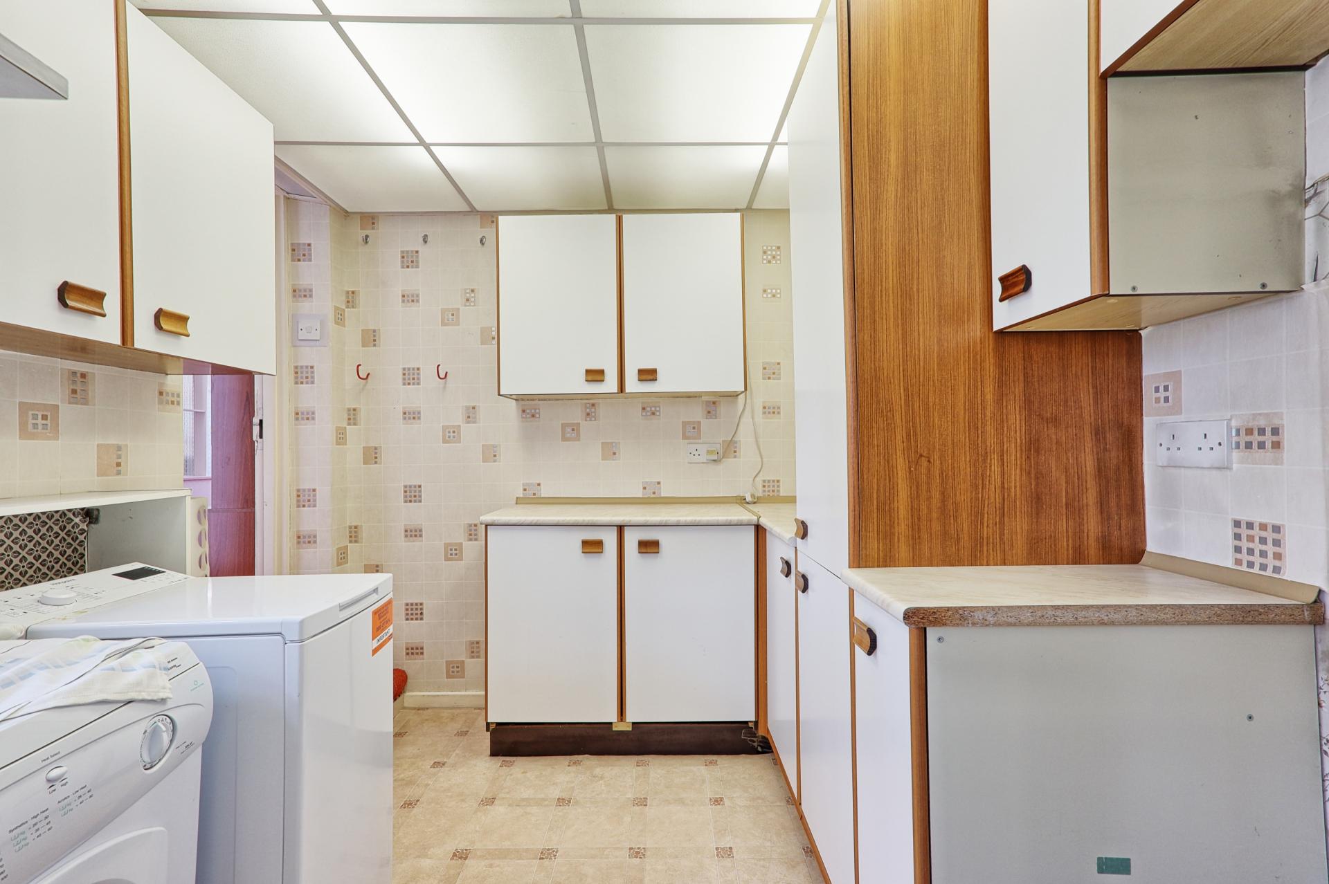 UTILITY ROOM 8' 4" x 7' 9" (2.54m x 2.36m) Fitted in a range of kitchen units offering storage to both ground and eye level with rolled edge work surfaces over. Space for fridge/freezers, plumbing for washing machine and tumble dryer. Cushion flooring. Suspended illuminated ceiling. Window to side. Further door giving access to.
