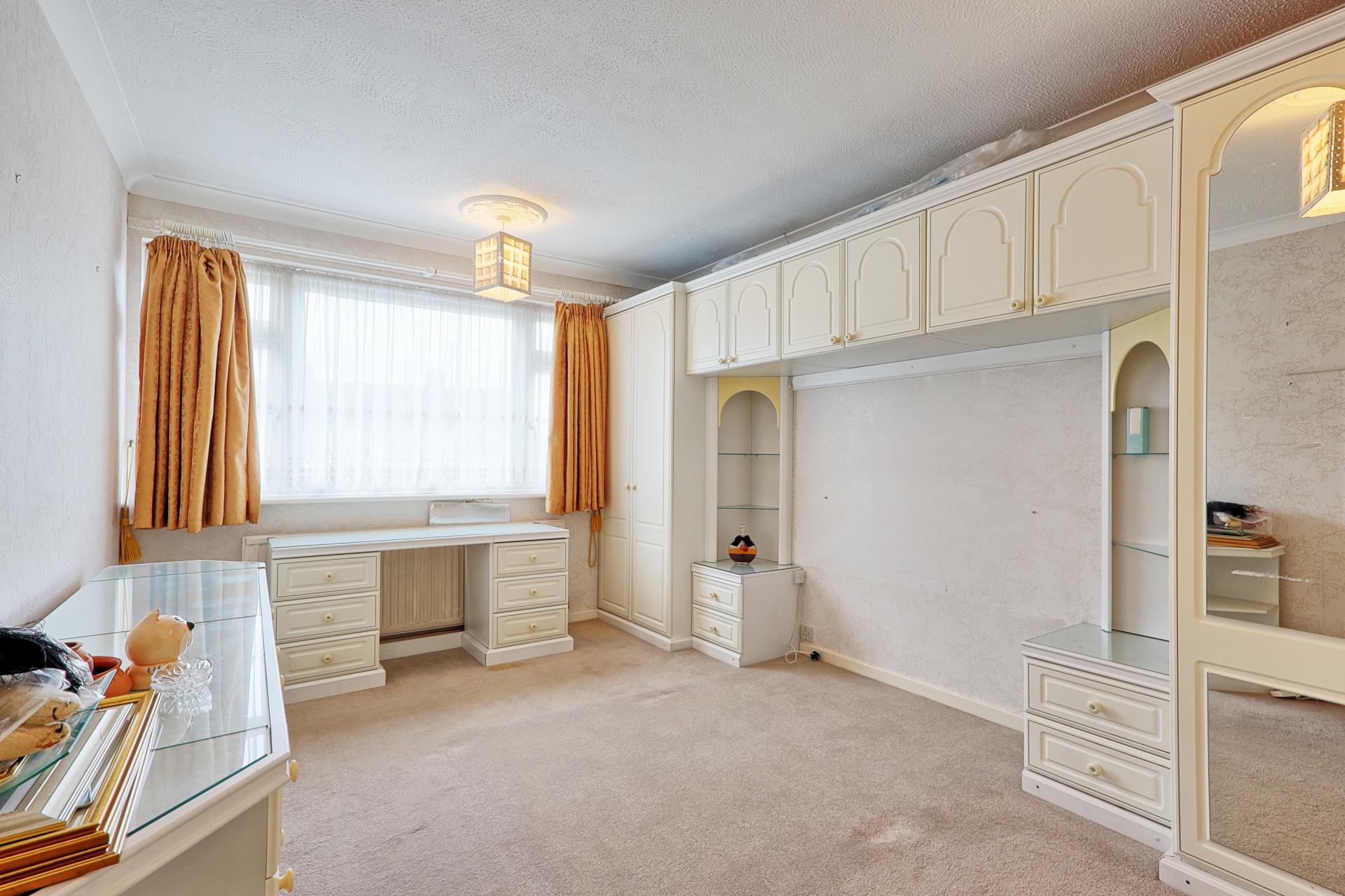 BEDROOM ONE 13' 7" x 10' 2 ( Measurements taken inside wardrobe )" (4.14m x 3.1m) Carpet. Radiator. Double glazed window to front. The room features a range of built in wardrobes to two walls with recess for double bed with cupboard over and matching bedside cabinets. Textured ceiling with ceiling rose and pendant lighting.