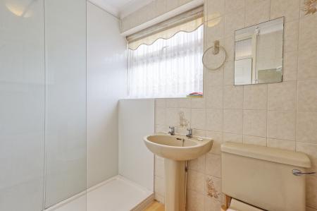 SHOWER ROOM Fitted in a three piece suite comprising of a large walk in shower with glass screen. Pedestal wash hand basin and close coupled W/C. Radiator. Fully tiled walls. Textured ceiling with coving. Wood effect cushion flooring. Obscure double glazed window to rear.