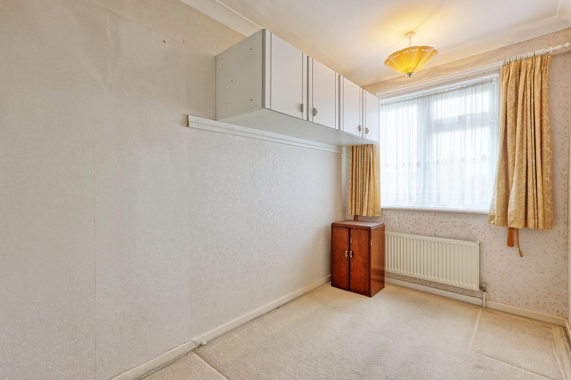BEDROOM THREE 10' x 6' 4" (3.05m x 1.93m) Carpet. Radiator. Double glazed window to front. Built in storage cupboards. Textured ceiling with coving. Access to loft.