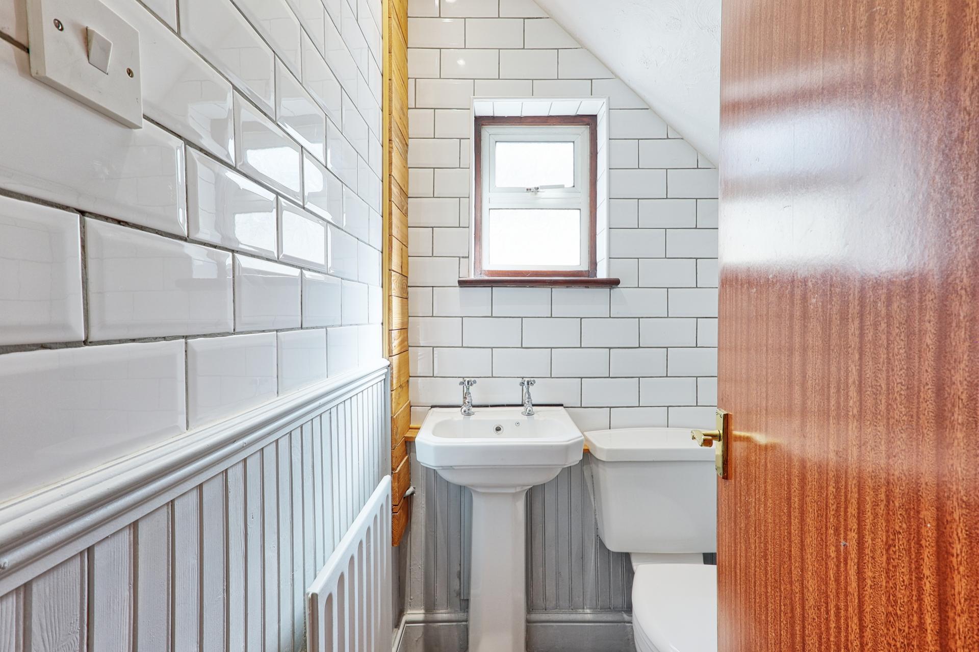 CLOAKROOM Fitted in a white two piece suite comprising pedestal wash hand basin and close coupled WC. Wood effect flooring. Tongue and groove panelling to rail height. Tiling to remaining walls. Radiator. Obscure double glazed window to side. Coved and artexed ceiling with spotlights.