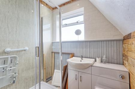 SHOWER ROOM Fitted in a three piece suite comprising walk-in shower cubicle with electric shower, wash hand basin and WC inset to vanity unit. Laminate flooring. Wood paneled walls to two walls with tiling and paneling. Obscure double glazed window to rear. Artexed ceiling with spotlights.