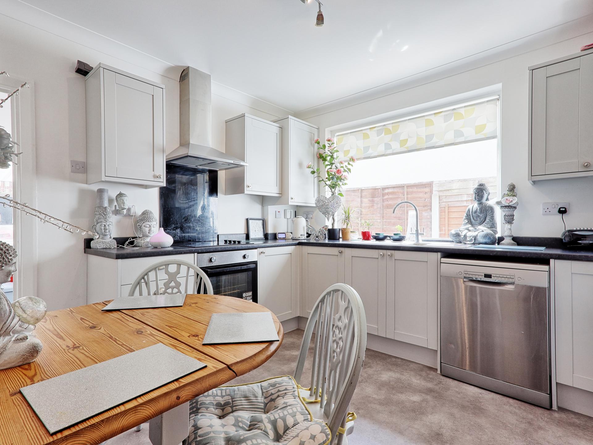 KITCHEN BREAKFAST ROOM 11' 1" x 11' 1" (3.38m x 3.38m) Fitted in a range of modern kitchen cupboards offering cupboards and drawer packs to ground and eyelevel with worktops over. Inset stainless steel 1 1/2 bowel single drainer sink unit. Inset oven grill and extractor. Space for dishwasher. Flat plastered ceiling with coving. Double glazed window to side. Cupboard housing boiler for heating and hot water. Doorwell through to