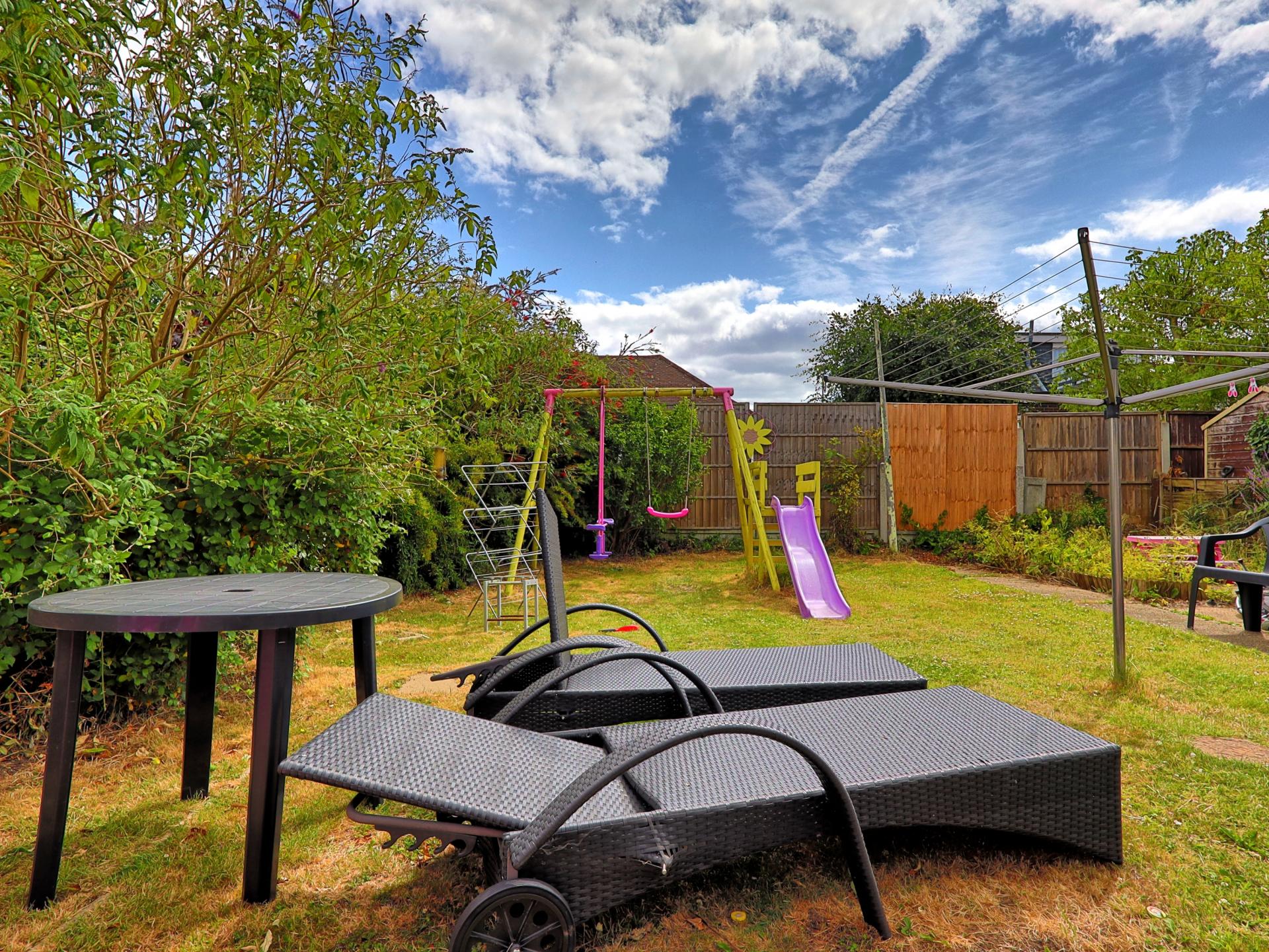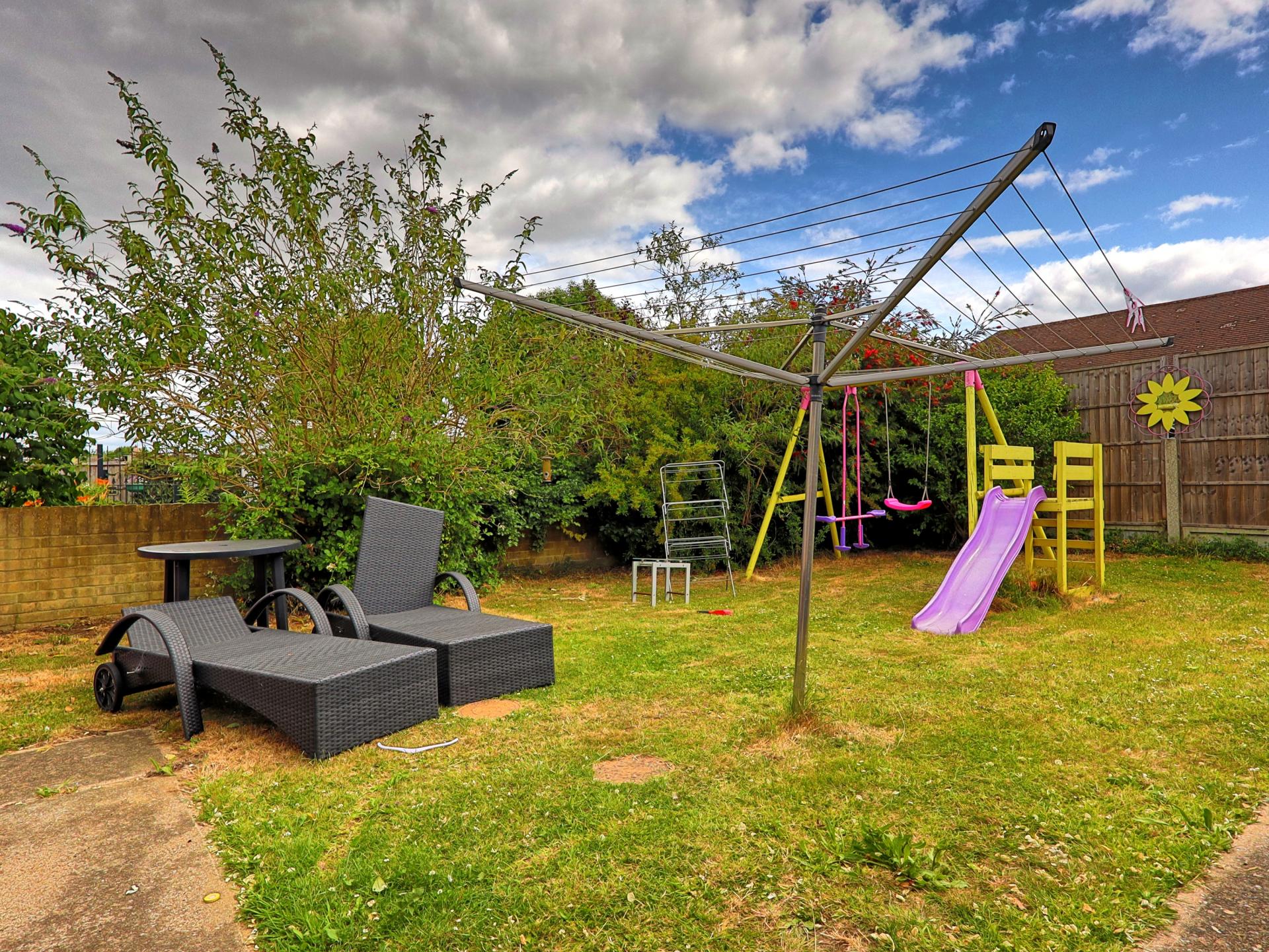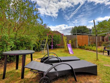 REAR GARDEN Laid to lawn with privacy fencing. Shed. Gated side access