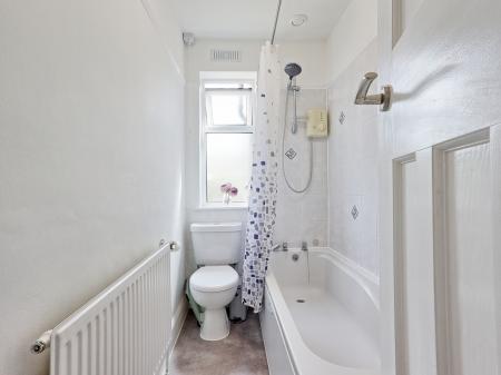 BATHROOM Fitted in a three piece suite comprising panel bath with electric shower over, pedestal wash hand basin and close coupled WC. Radiator. Cushion flooring. Tiled to two walls. Obscure double glazed window to rear. Flat plastered ceiling with extractor fan.