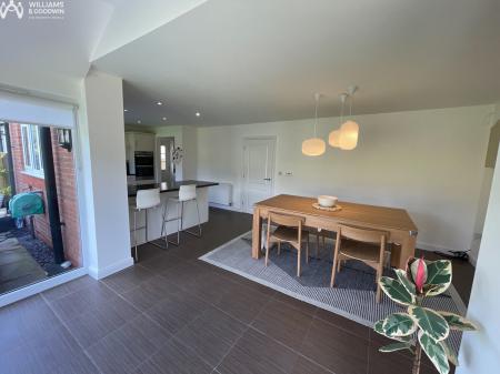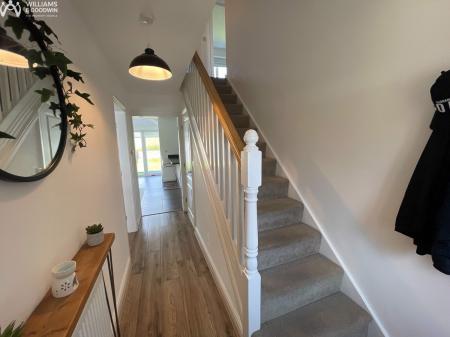Greeted into the hallway leading on to the main reception room to the left with feature media wall and storage. To the rear is the impressive living/kitchen/dining accommodation with low level glazing drawing you into the garden. Linking on to the Utility space off the kitchen housing appliances and wash down sink unit and side access door with pathway linking to the garage to the front. The practicality doesn’t stop there with the added benefit of a ground floor WC. The first floor landing opens to the family bathroom and storage/airing cupboard and to the FOUR DOUBLE BEDROOMS with the primary bedroom benefitting from fitted wardrobes and en-suite shower room.