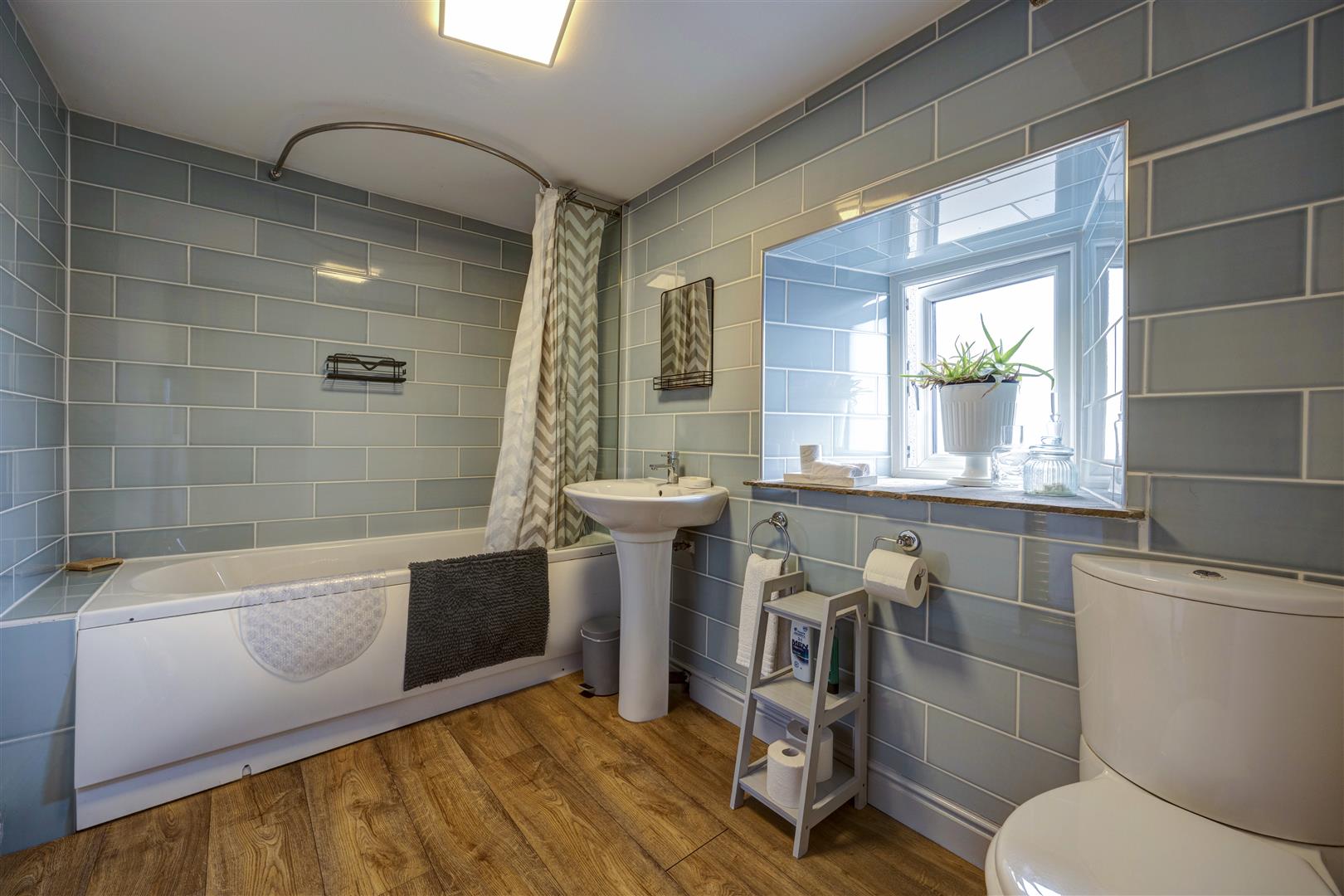 Bathroom - Wooden floorboards, heated towel rail, wash basin, toilet, bath with shower over, exposed beam, double glazed window with privacy glass to rear aspect.