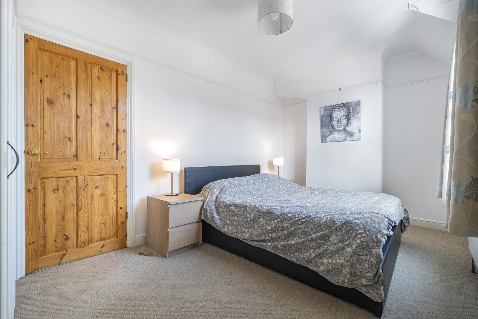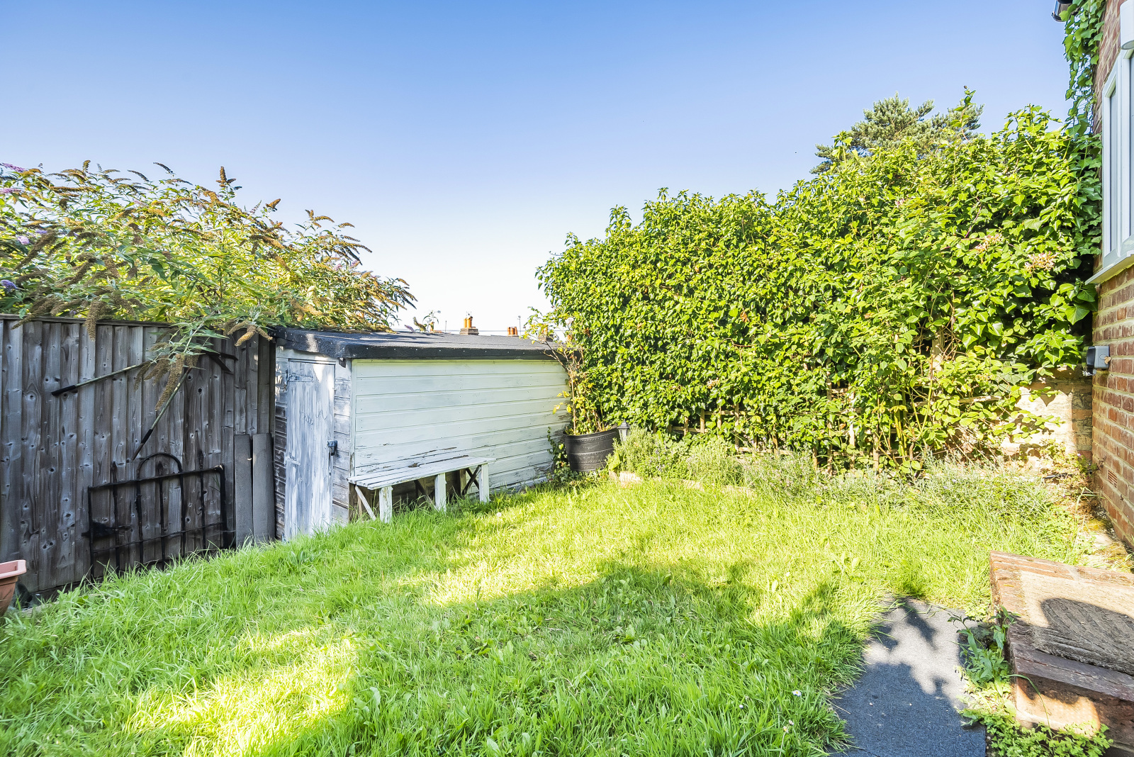 Driveway parking with steps leading up to the garden. There is further permit parking at the front of the property. The garden is private and enclosed with a wooden shed.