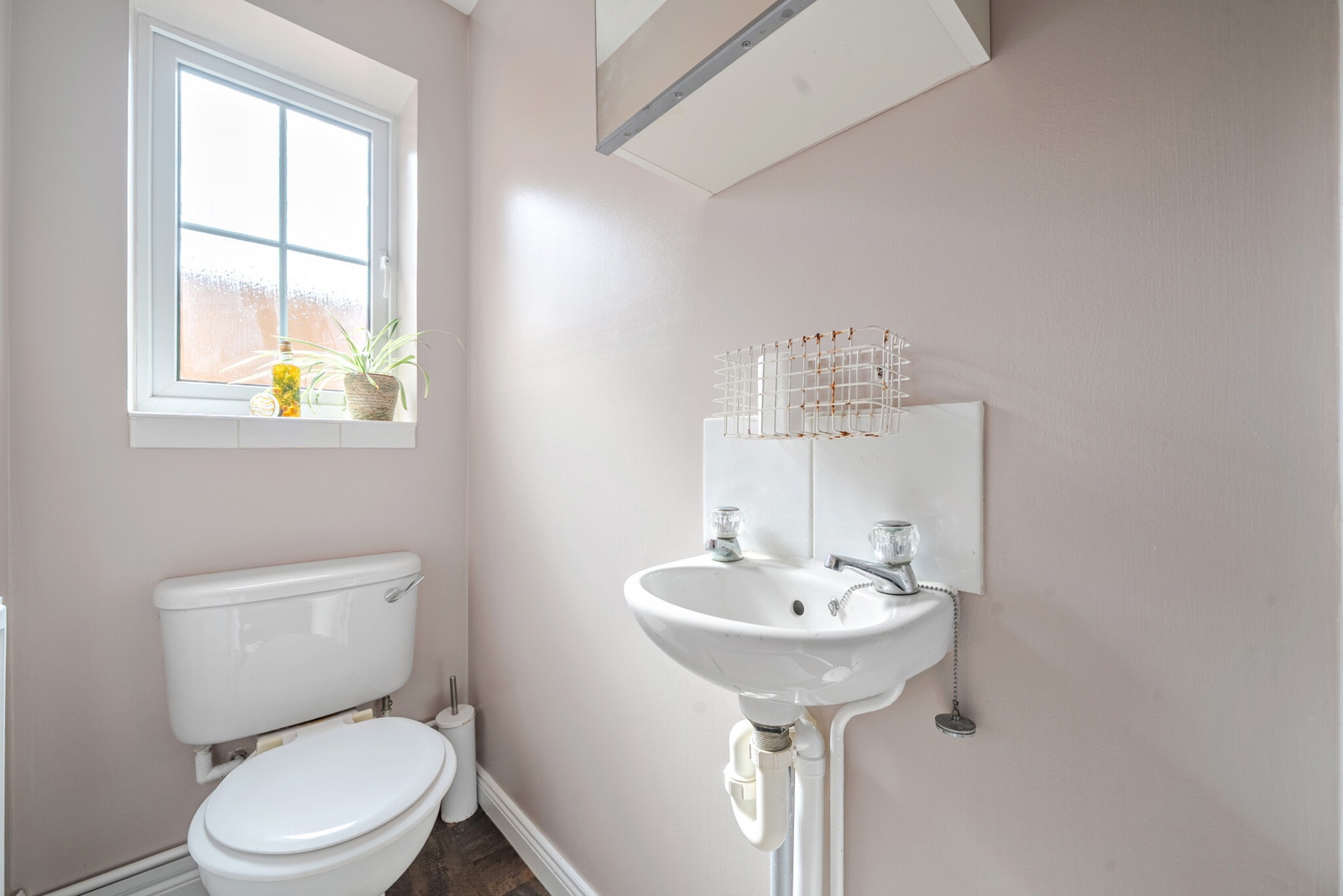 The property is entered via a central hallway with stairs to the first floor and doors leading to the living room, refitted kitchen/dining area, W.C., and integral garage. Upstairs, a central landing provides access to all bedrooms and the family bathroom, with the primary bedroom featuring a refitted en-suite.