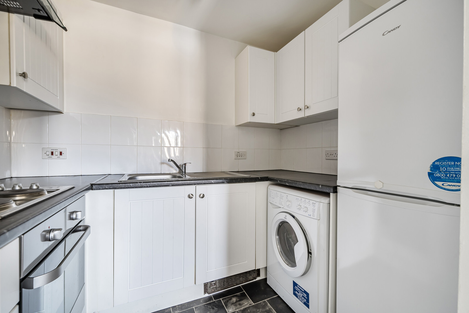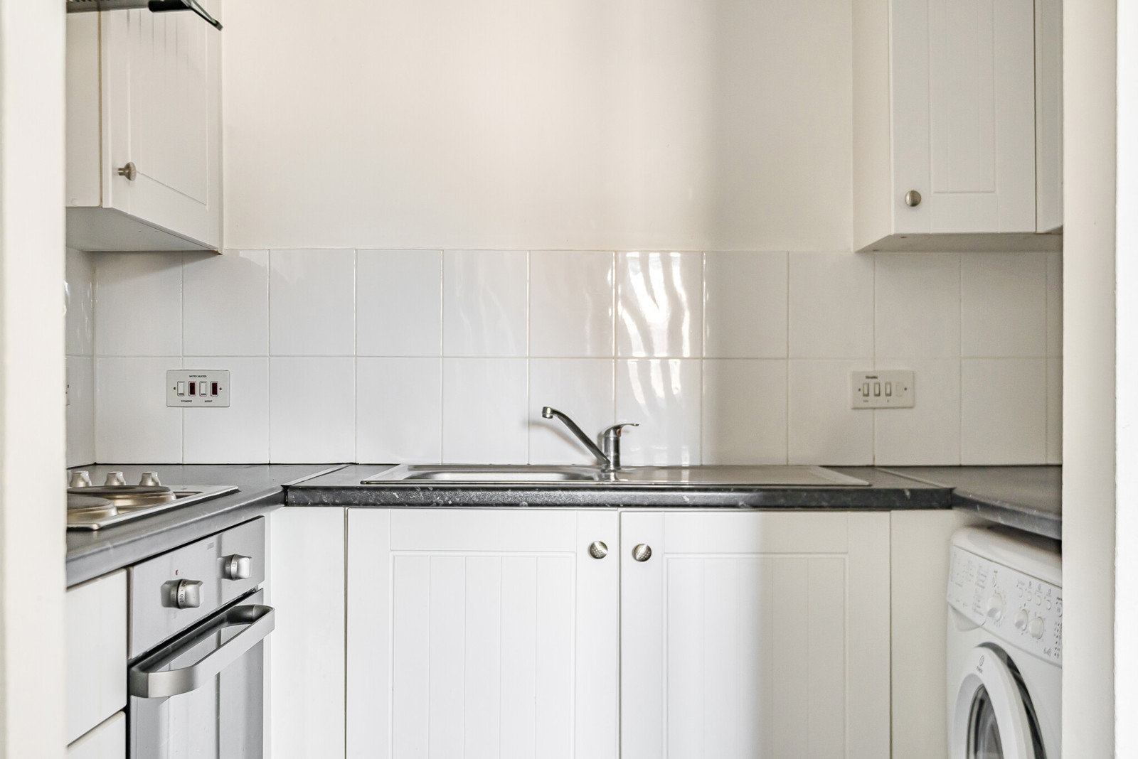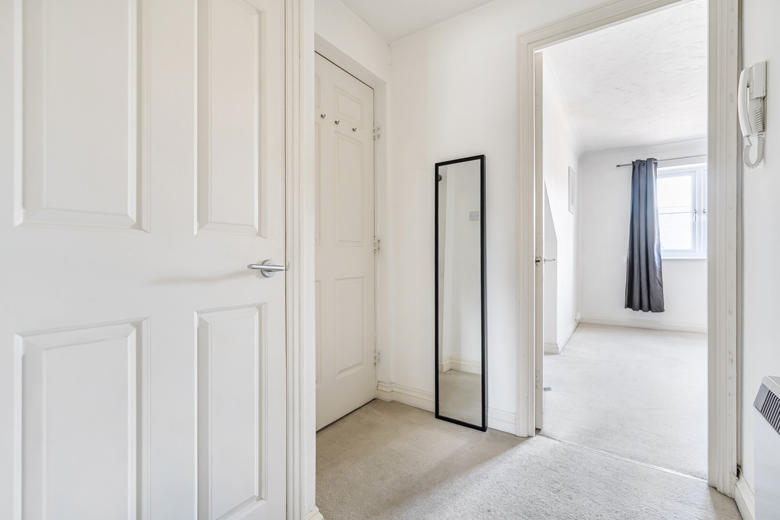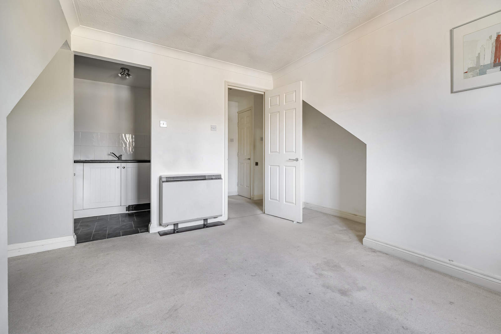 The property is entered through a hallway featuring an airing cupboard and two additional storage cupboards. From here, doors lead to the bedroom, bathroom, and the spacious living room, which flows seamlessly into the kitchen.