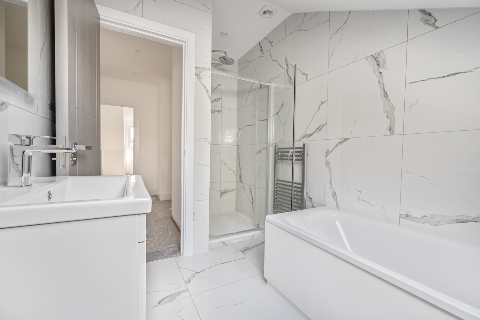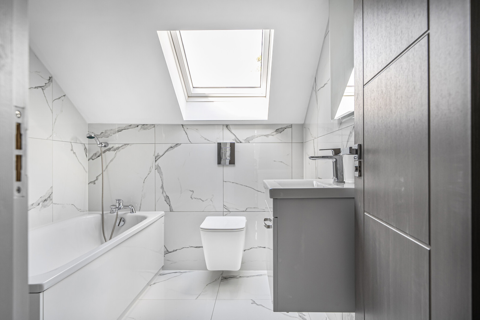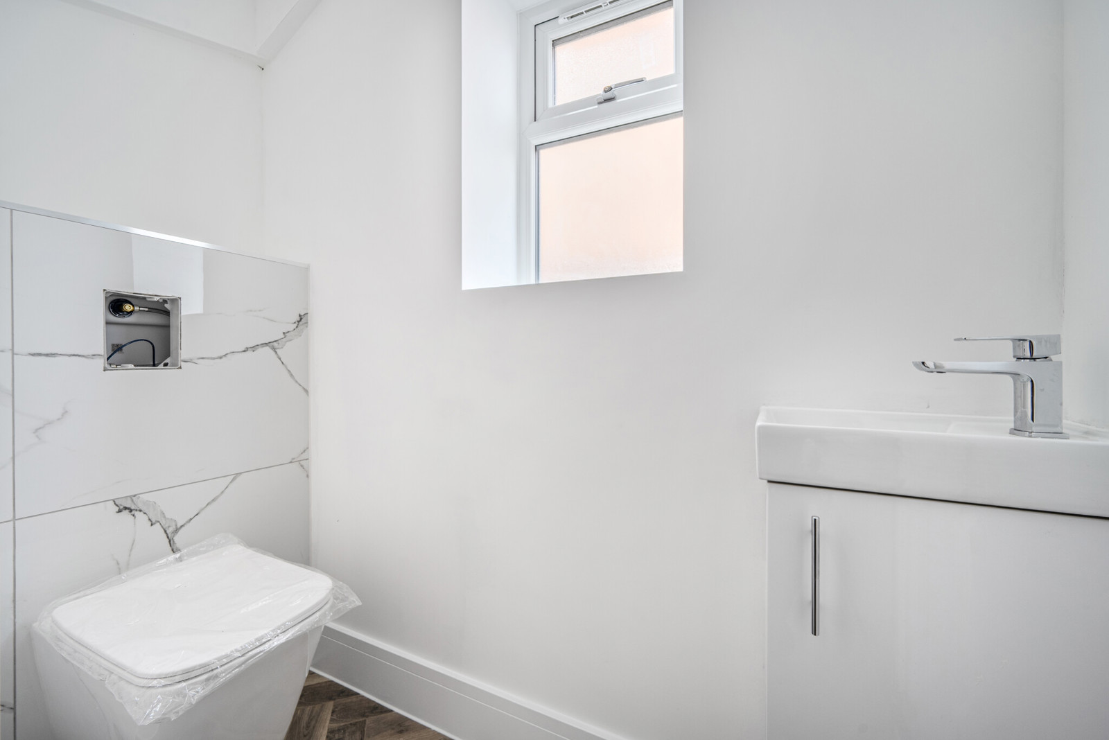 Welcoming entrance hall with cloakroom. A stylish kitchen/breakfast room featuring Quartz worktops and integrated appliances. To the rear, a spacious sitting/dining room opens through bi-fold doors onto a covered porch. Upstairs, the principal bedroom is complemented by a contemporary four-piece bathroom, complete with a rainfall shower and elegant porcelain tiling. There are two further bedrooms.