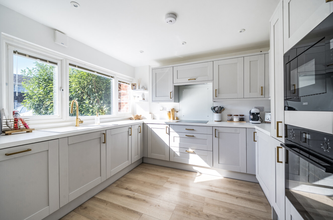 On entry, youre welcomed by a hallway leading to the kitchen on the left, offering plenty of cupboard and worktop space comfortably accommodating two people cooking side by side. At the end of the hallway, the living room impresses with modern spotlights, stylish panelling, and a balance of cosy charm with ample space for both family living and entertaining. From here, sliding patio doors open seamlessly onto the rear garden. Larger than average, the garden enjoys excellent sunlight, a continuous flow from indoors, and the added bonus of side access to the front.