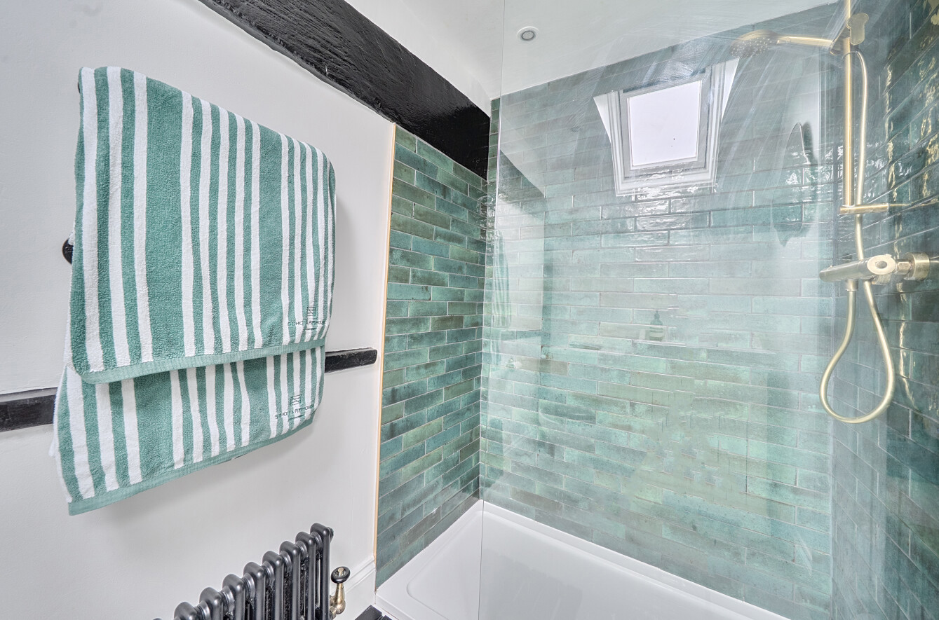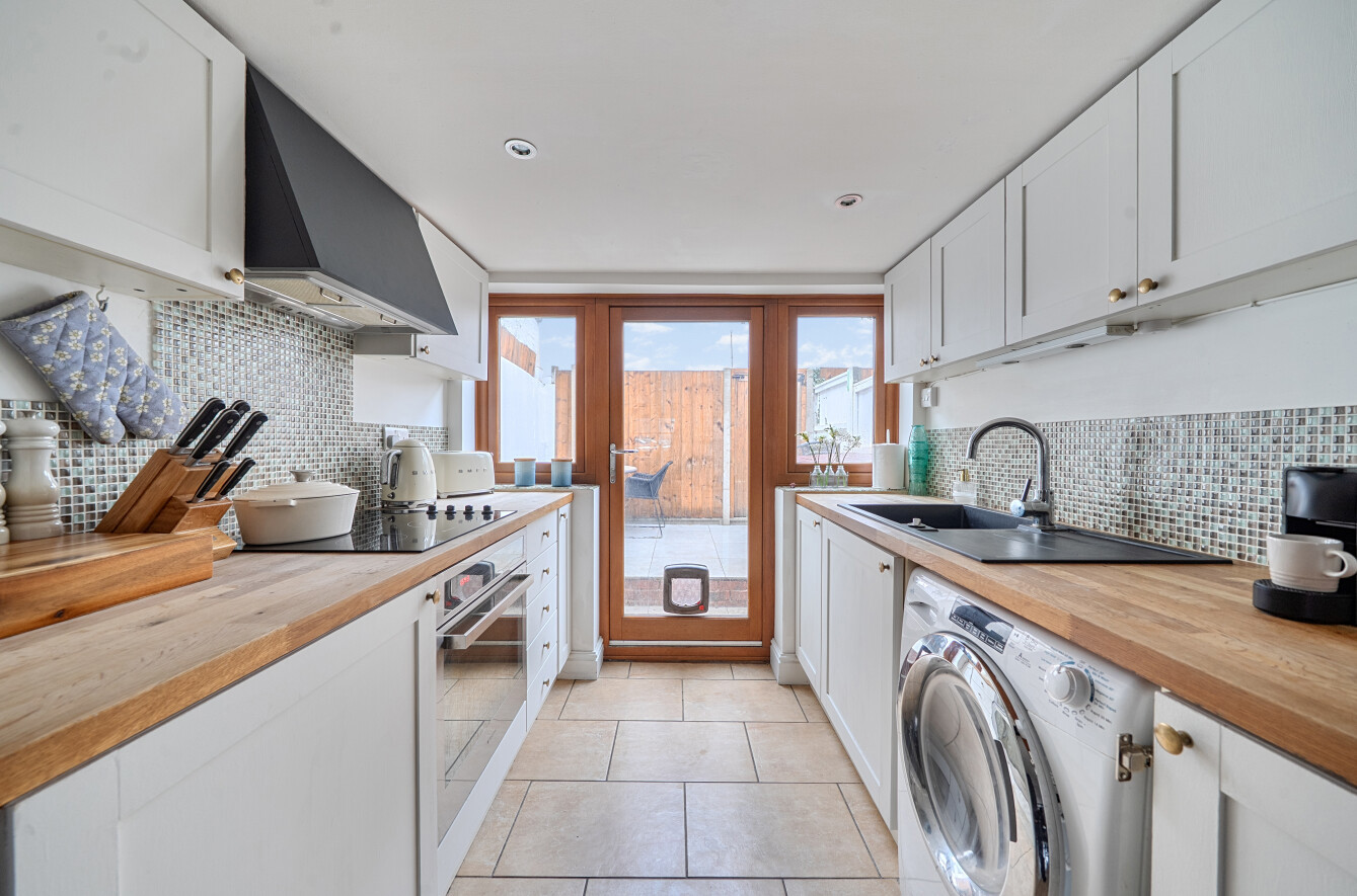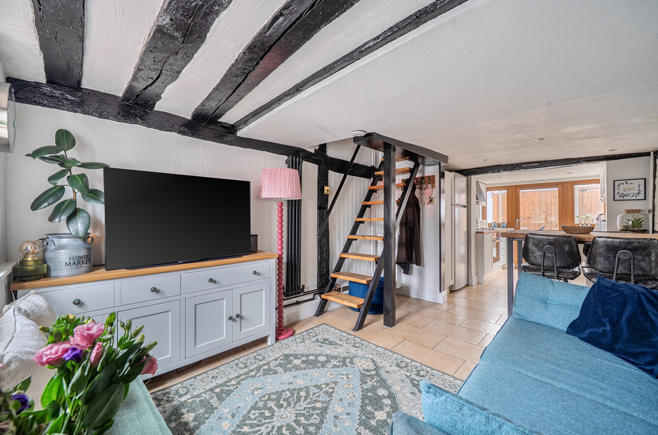 You enter into a welcoming living room which is a wonderful, homely space with a charming, exposed staircase that leads to the first floor. The living room leads directly through to the kitchen, offering plenty of cupboard and worktop space, with access out to the courtyard garden. The layout flows nicely and feels practical for everyday living.