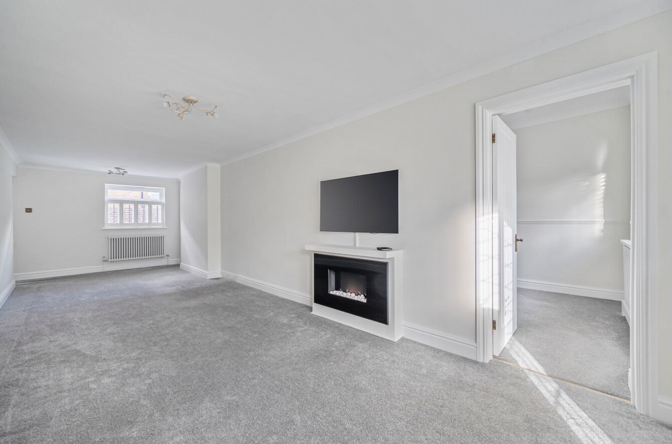 The accommodation continues with two very well-proportioned double bedrooms; the principal bedroom is particularly striking, measuring over 20 feet in length, providing more than enough space for a king-size bed alongside additional furniture or a dedicated dressing area. The second bedroom is also a generous double, perfect for guests or a home office. Both bedrooms benefit from large built-in wardrobes, complemented by a modern three-piece bathroom and additional hallway storage.
