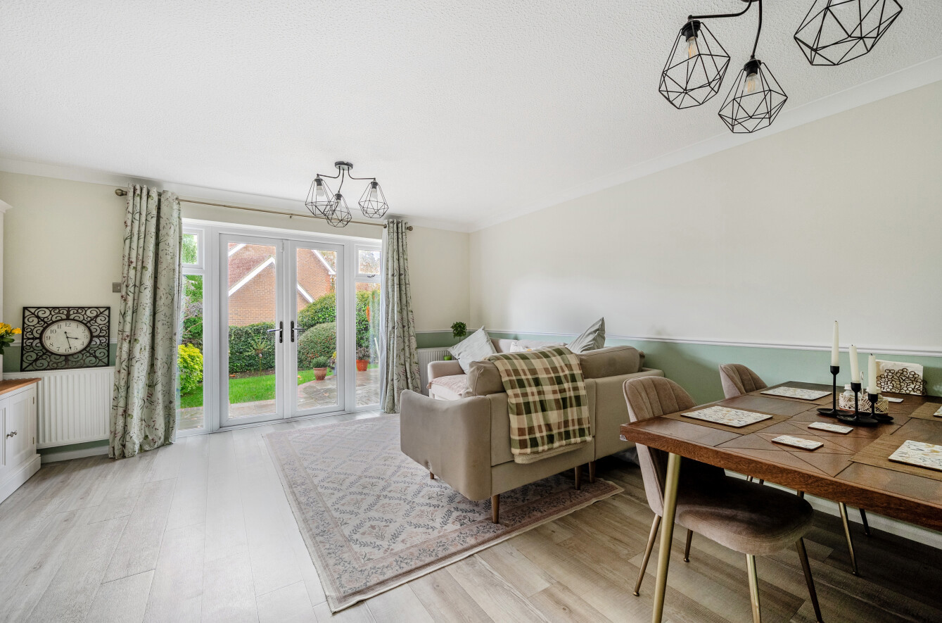 At the end of the hallway sits a bright and spacious living room, complete with chic double doors that open seamlessly onto the garden, creating a lovely flow between indoor and outdoor spaces. Theres also ample room to accommodate a large dining table, perfect for entertaining family and friends.