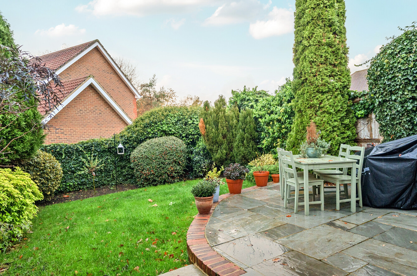 The westerly rear garden is beautifully landscaped with a charming patio area that captures the afternoon sun, along with a neat level lawn framed by mature shrubbery for excellent privacy.