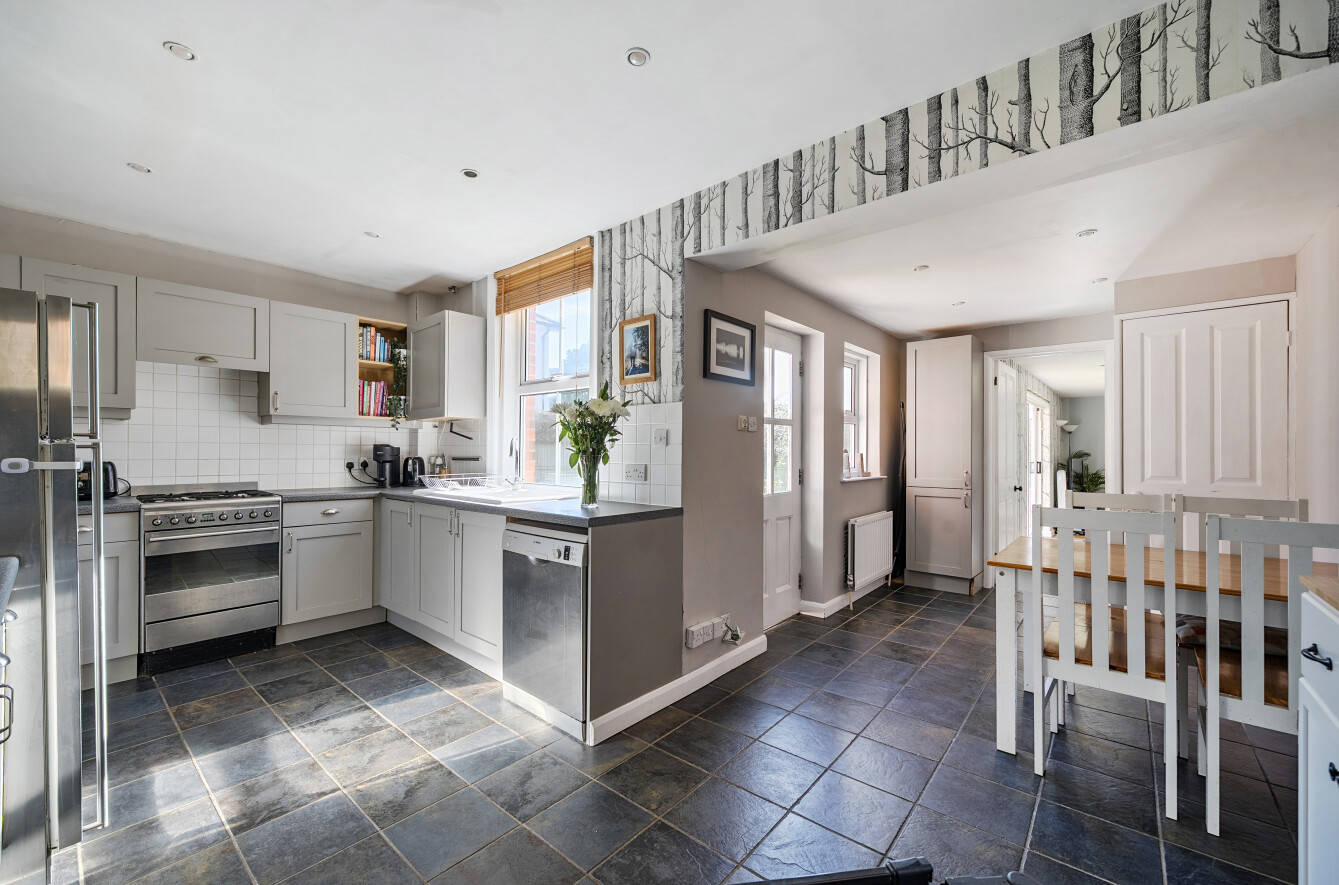 At the heart of the home is the kitchen, extended to include a dining area and an additional reception space currently used as a playroom. With doors to the garden, this area has great potential to become a more modern, open-plan living space if desired. A ground-floor WC adds practicality.