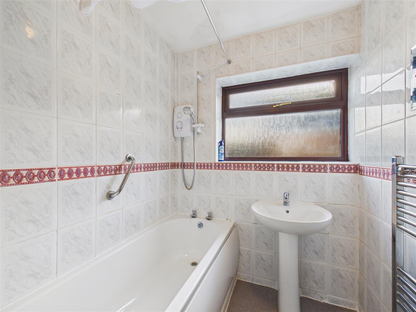 Bathroom - With white bath, shower over, pedestal wash hand basin, tiling to the walls. Heated towel rail.