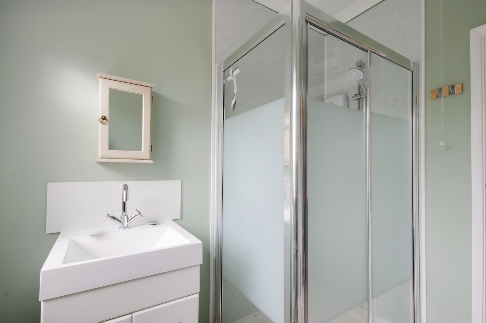 Bathroom 7'6" x 6'2" (2.29m x 1.88m). Double glazed opaque window to rear. Wood effect vinyl flooring. Plain coved ceiling. Shower cubicle with Triton shower and panel walls. Vanity wash hand basin. Roca close coupled W.C. Xpelair extractor fan. Wall mounted consort cabinet housing heater. Mirrored wall cabinet.
