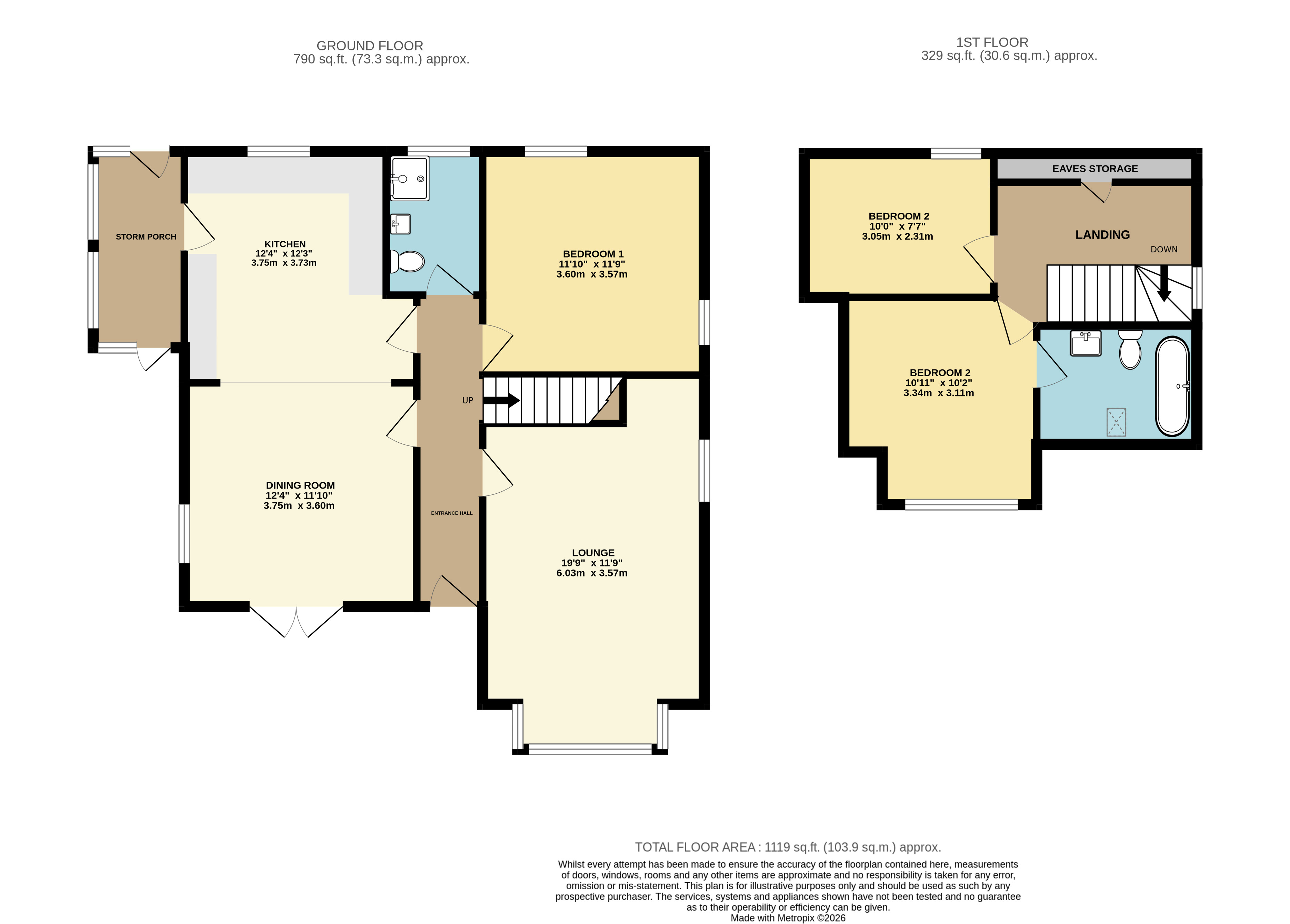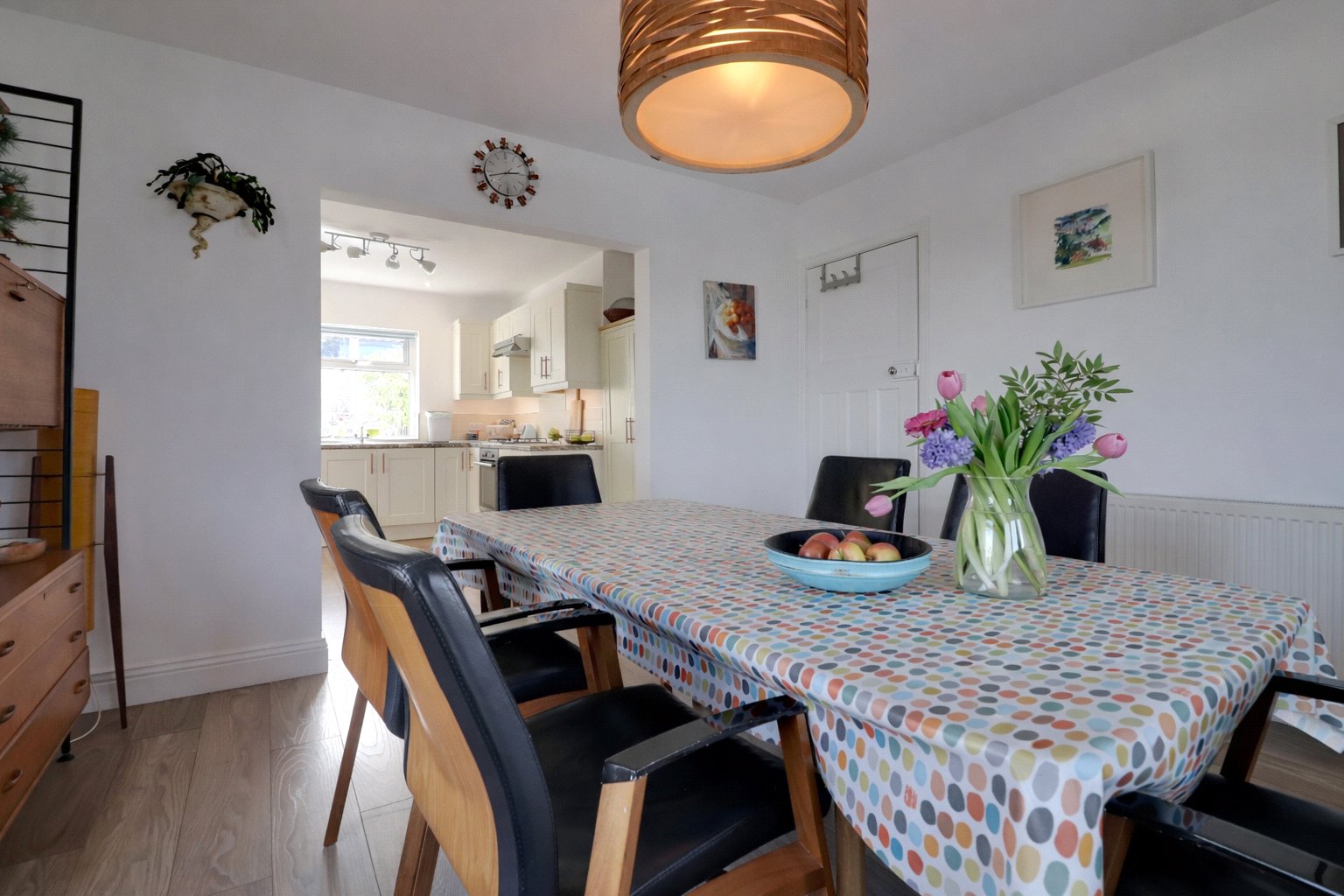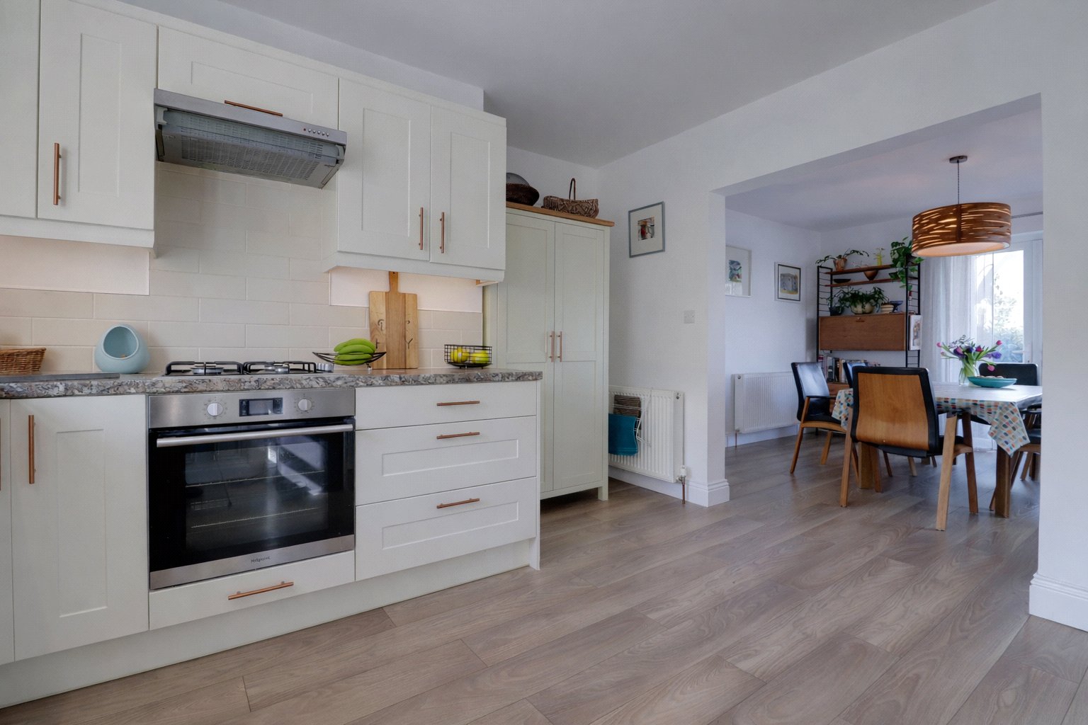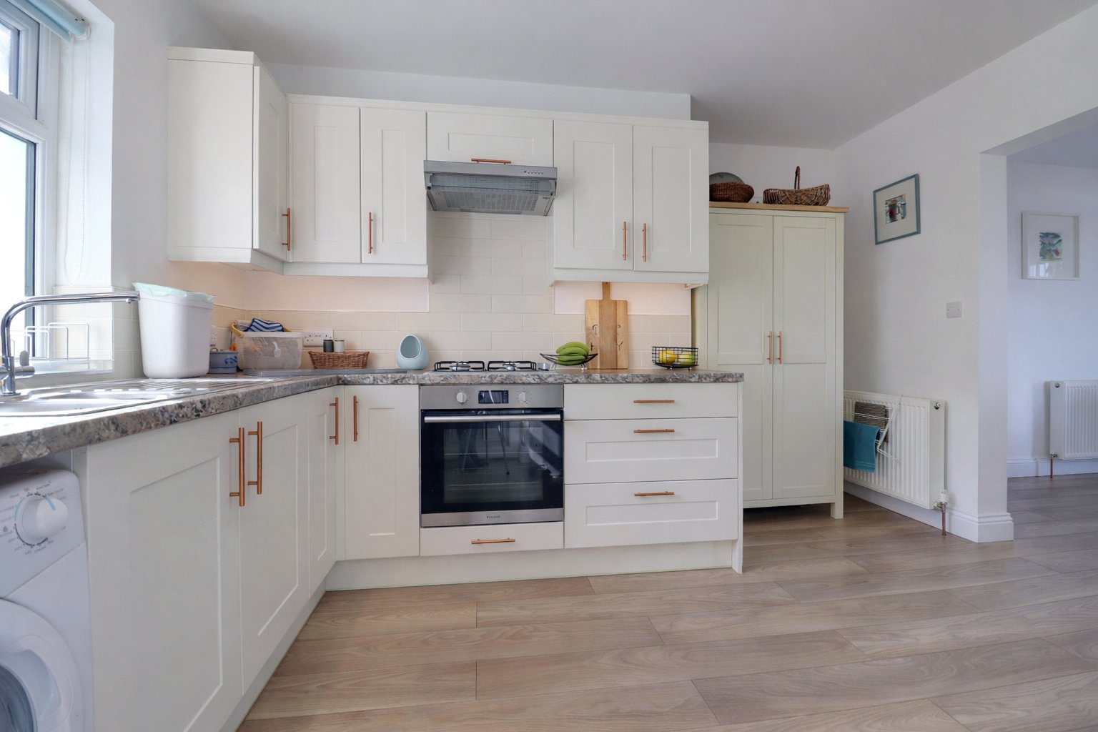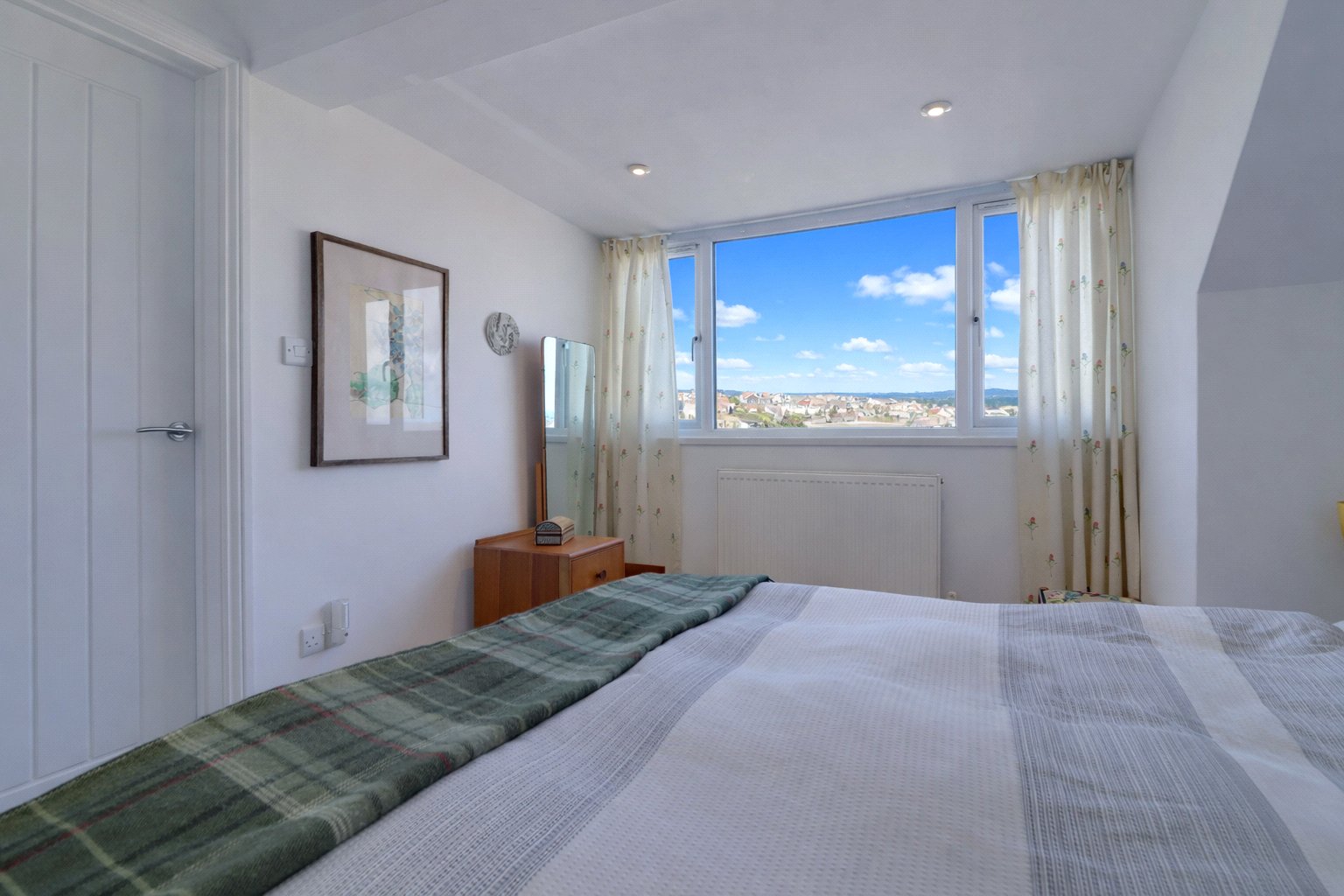 Stairs rise to the first floor, opening onto a light and airy landing that also benefits from practical eaves storage. From here, a door leads to bedroom three, a compact yet versatile room, offering sufficient space for a bed and furnishings, making it ideal as a guest room or dressing room. To the front of the property, the master bedroom is a generously sized double, enjoying pleasant outlooks and providing a relaxing retreat. This room is further enhanced by the added convenience of a private ensuite bathroom.
