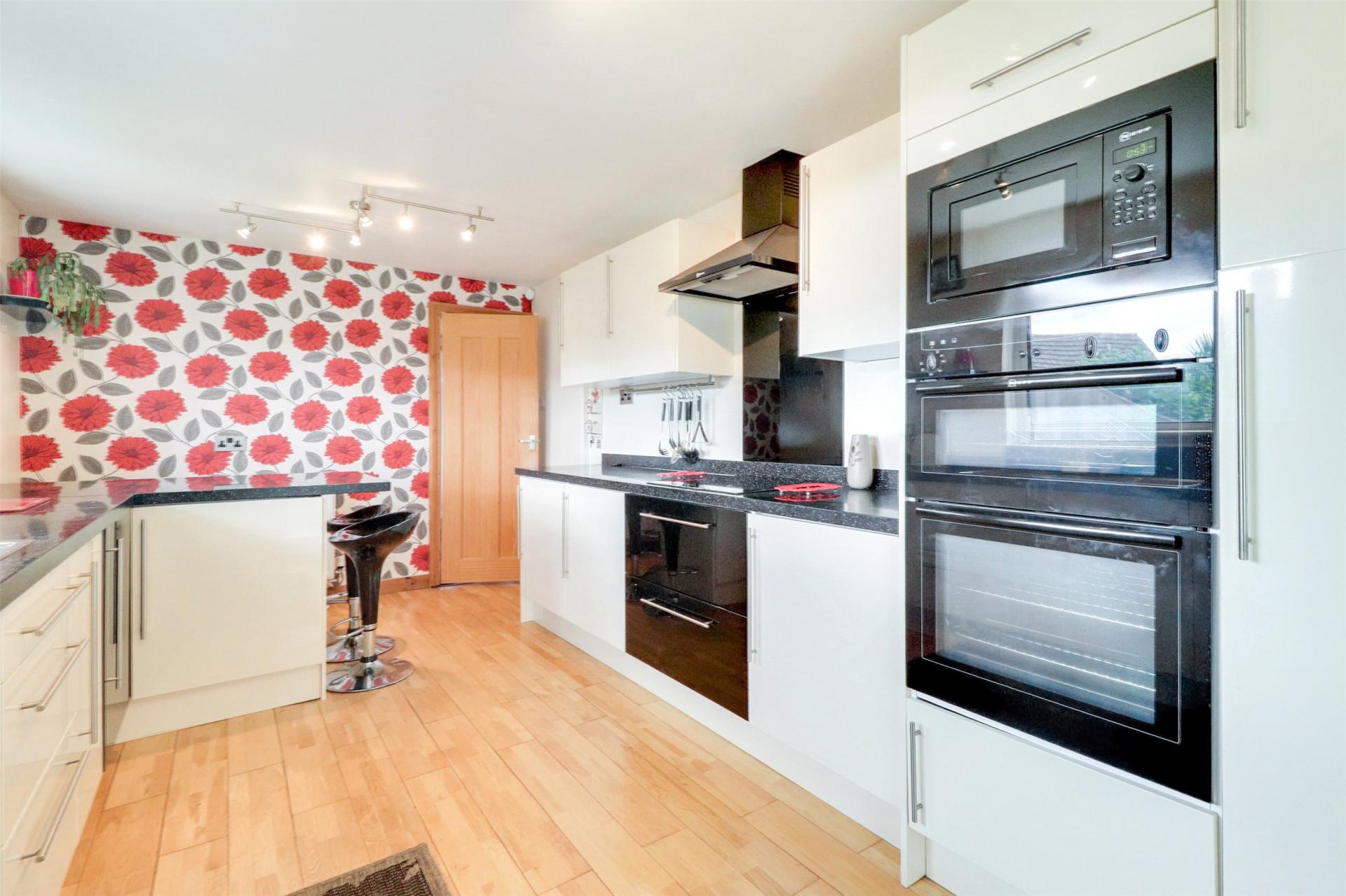 The modern fitted kitchen enjoys views over the rear garden and is equipped with a range of eye-level and base units, complemented by a practical breakfast bar perfect for entertaining or enjoying a quick morning coffee. Integrated appliances include an electric oven and hob, along with a fitted dishwasher and fridge/freezer.