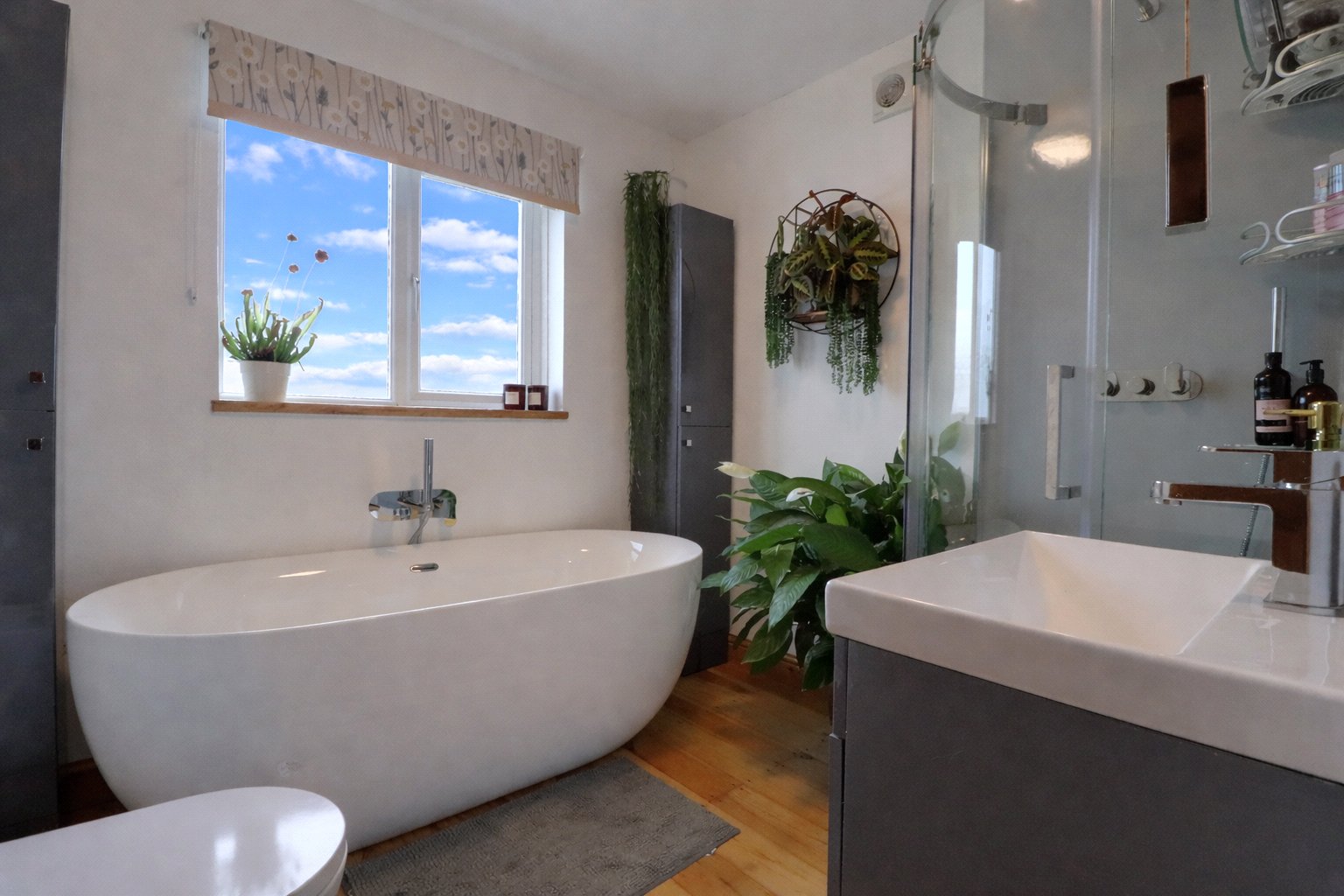The principal Bedroom enjoys lovely views, fitted wardrobes and a large stylish en-suite bathroom with freestanding bath, separate shower, WC and wash hand basin. There are 3 further good sized bedrooms, 2 with lovely views to the front as before. Family Bathroom and a useful separate utility area with space and plumbing for appliances.