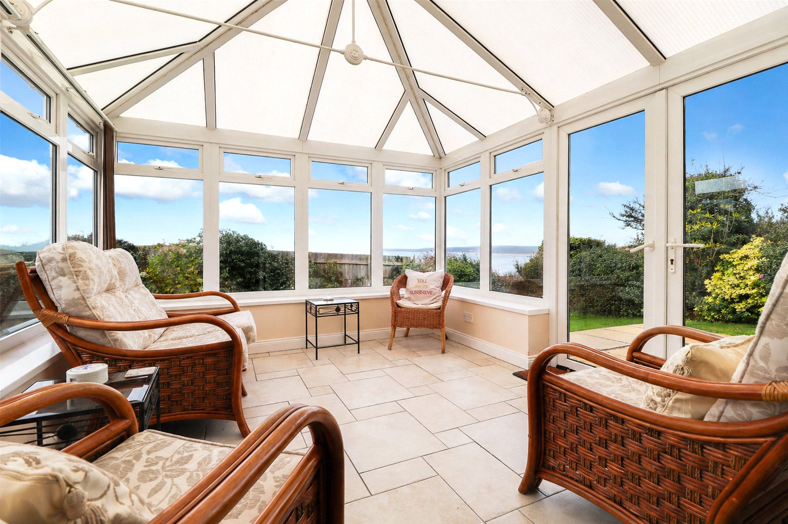 Continuing through the hallway toward the rear of the property, you enter a spacious lounge that provides ample room for substantial furnishings. A central fireplace serves as a charming focal point, adding warmth and character to the space. From the lounge, patio doors open into the rear conservatory, offering additional seating and a relaxing spot to enjoy views of the garden and the far-reaching sea beyond.