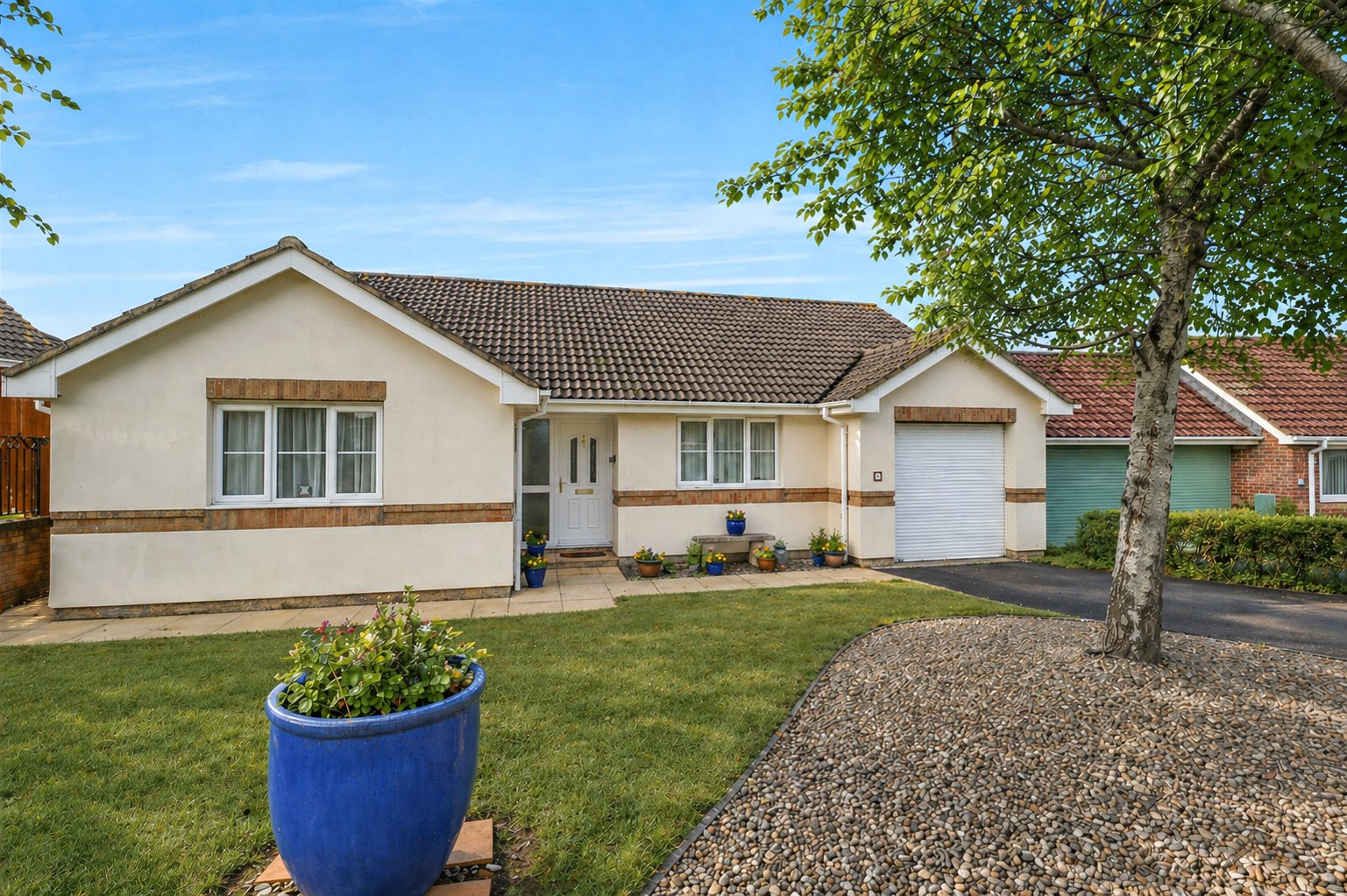 Outside, the enclosed rear garden features a hardstanding area adjoining the conservatory, providing the perfect space for outdoor dining or relaxing while enjoying the views. Beyond this, a well-kept lawn is bordered by mature shrubs and bushes, adding greenery and privacy. A pathway leads from the rear to the front of the property, which offers a low-maintenance frontage laid with stone chippings, a driveway providing off-road parking, and access to the garage.