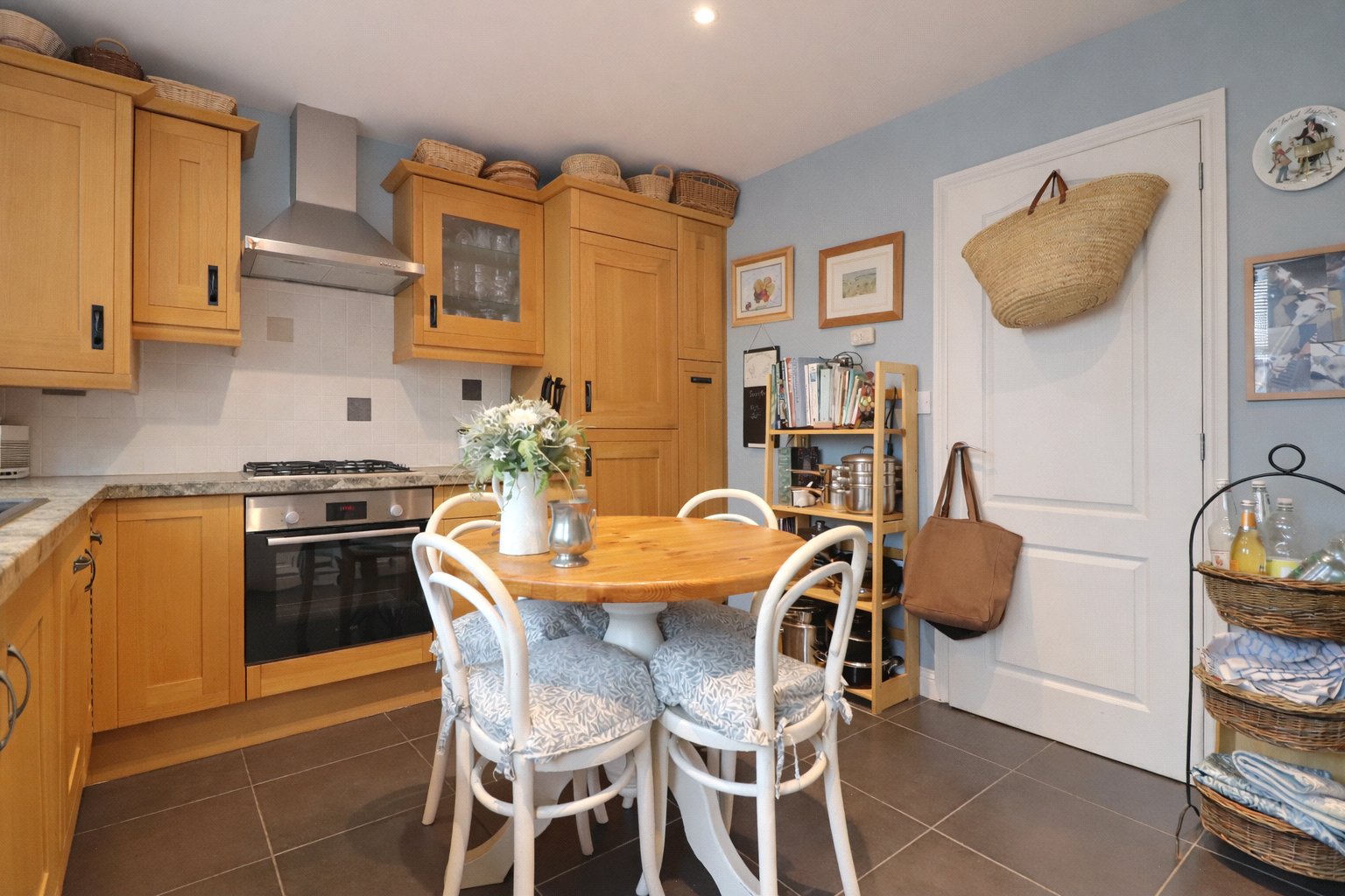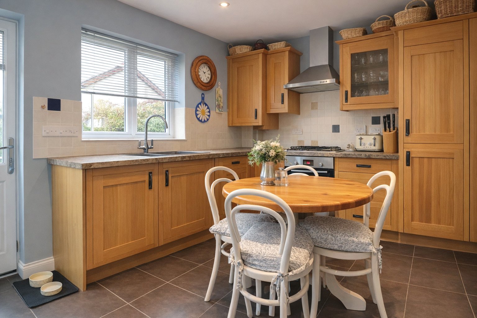 The kitchen/breakfast room is fitted with a range of base and eye-level units topped with composite work surfaces. Integrated appliances include a four-ring hob with extractor over, oven, dishwasher and fridge/freezer, while an external door provides convenient access to the side of the property.