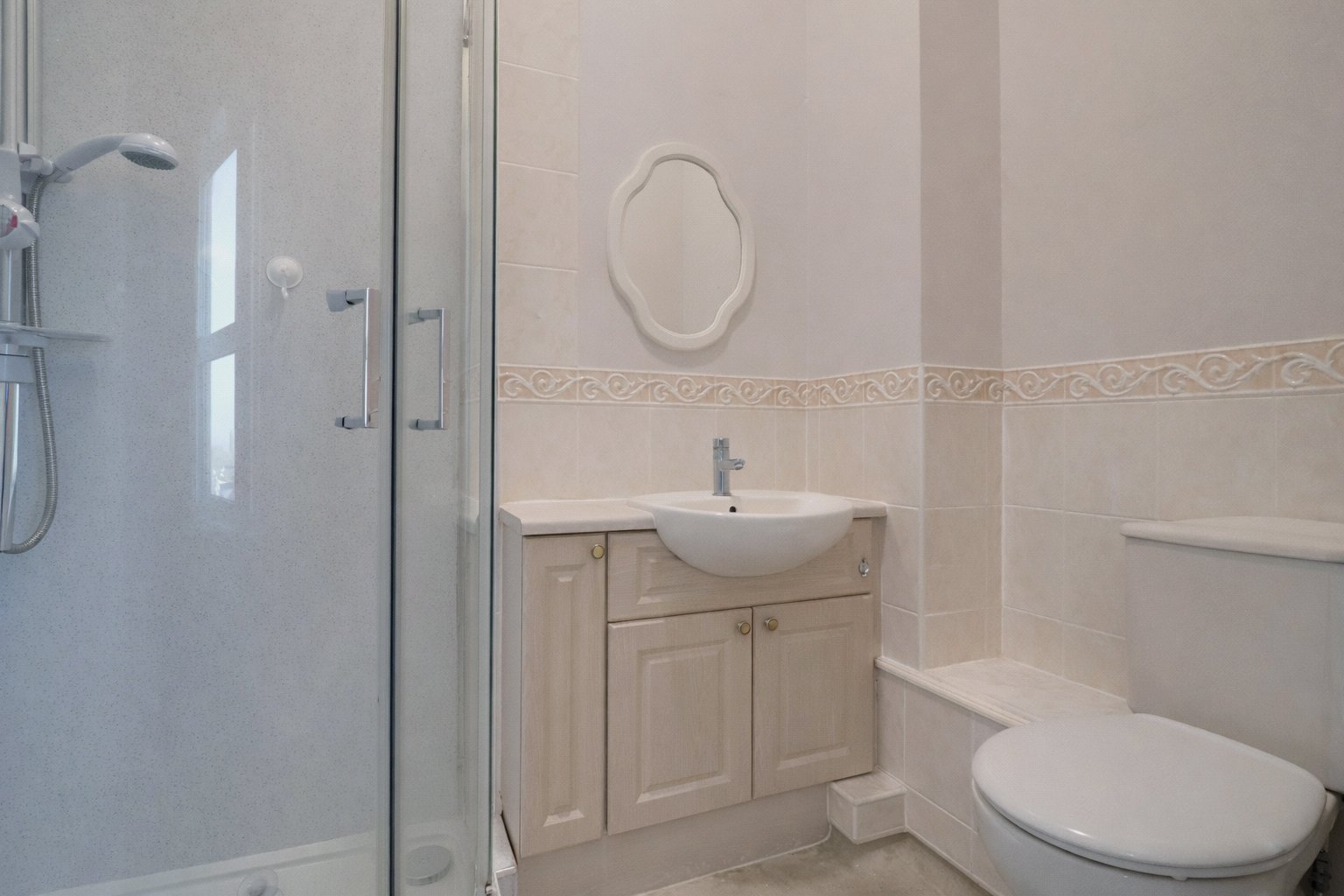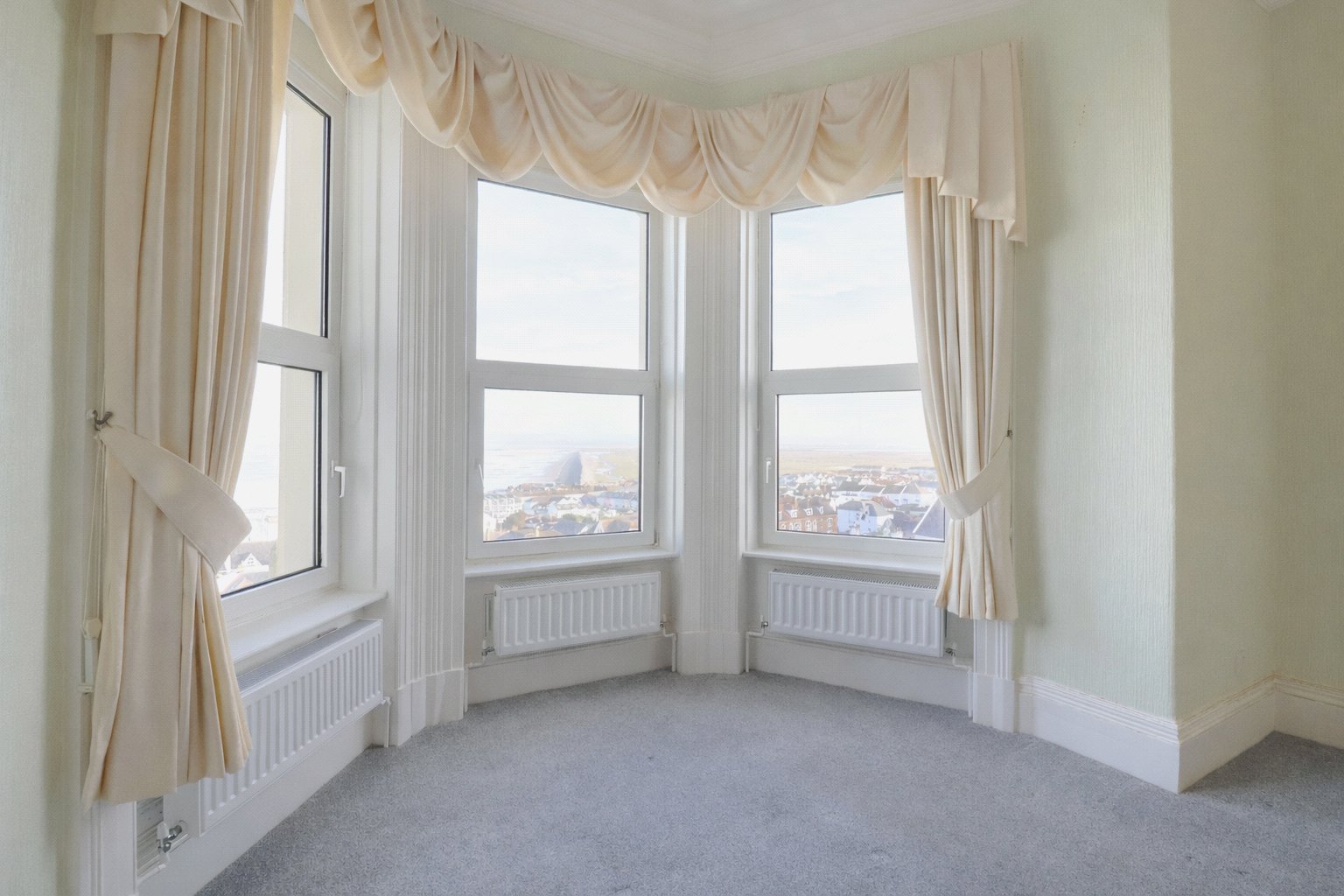 Heading into the wide entrance hall of apartment 11, a good space for coats and shoes. A door left leads to the main bedroom. This is a generous sized room, with space for ample furniture and a large window with coastal views. A useful cupboard offers storage space. From here lies the bathroom offering a modern suite with corner shower.