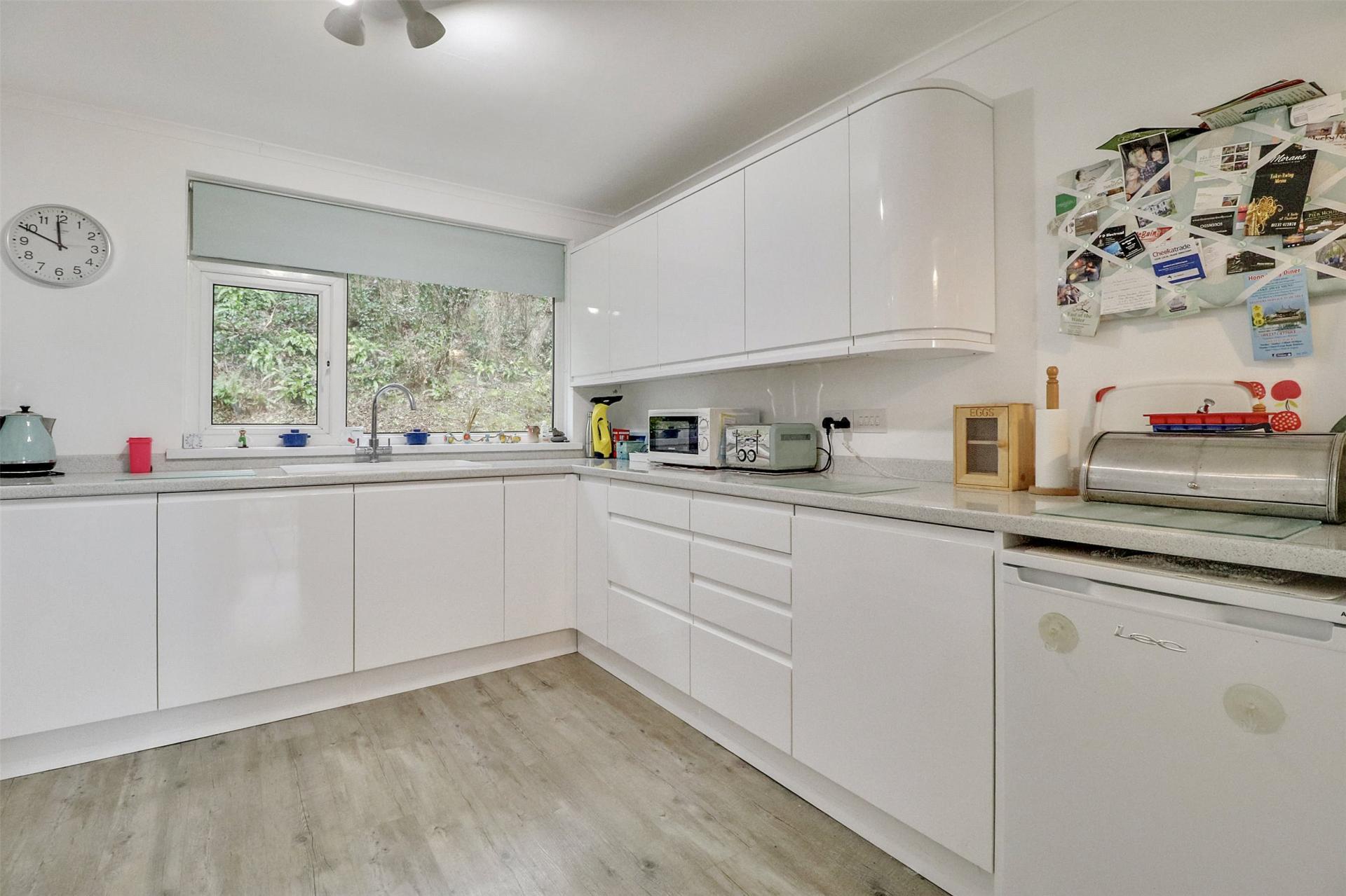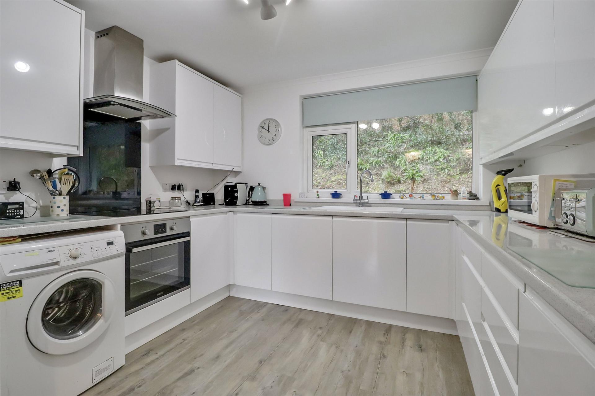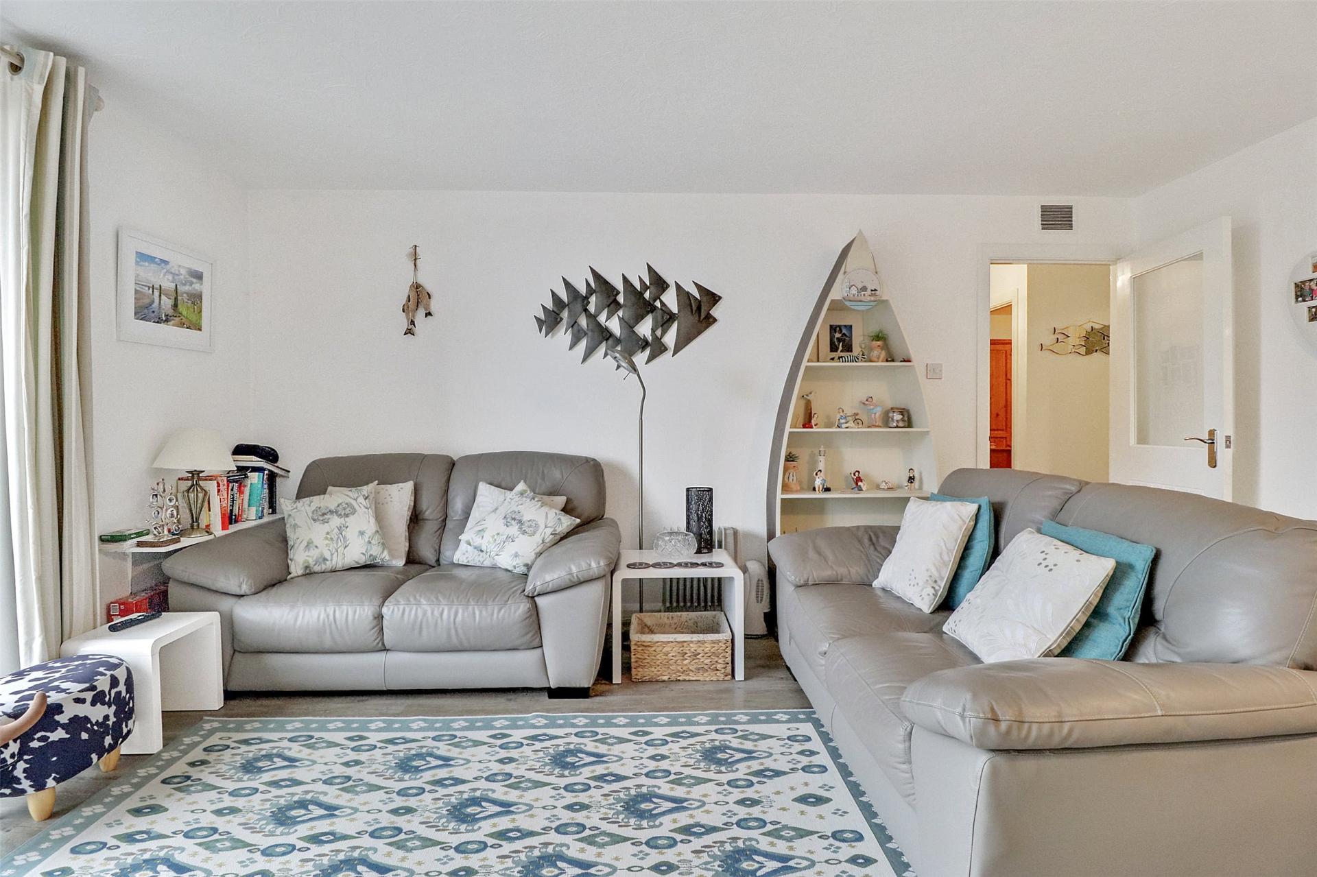 The living area flows seamlessly into a modern fitted kitchen, complete with a range of eye- and base-level units, an electric oven, hob and dishwasher, plus additional space for freestanding appliances.