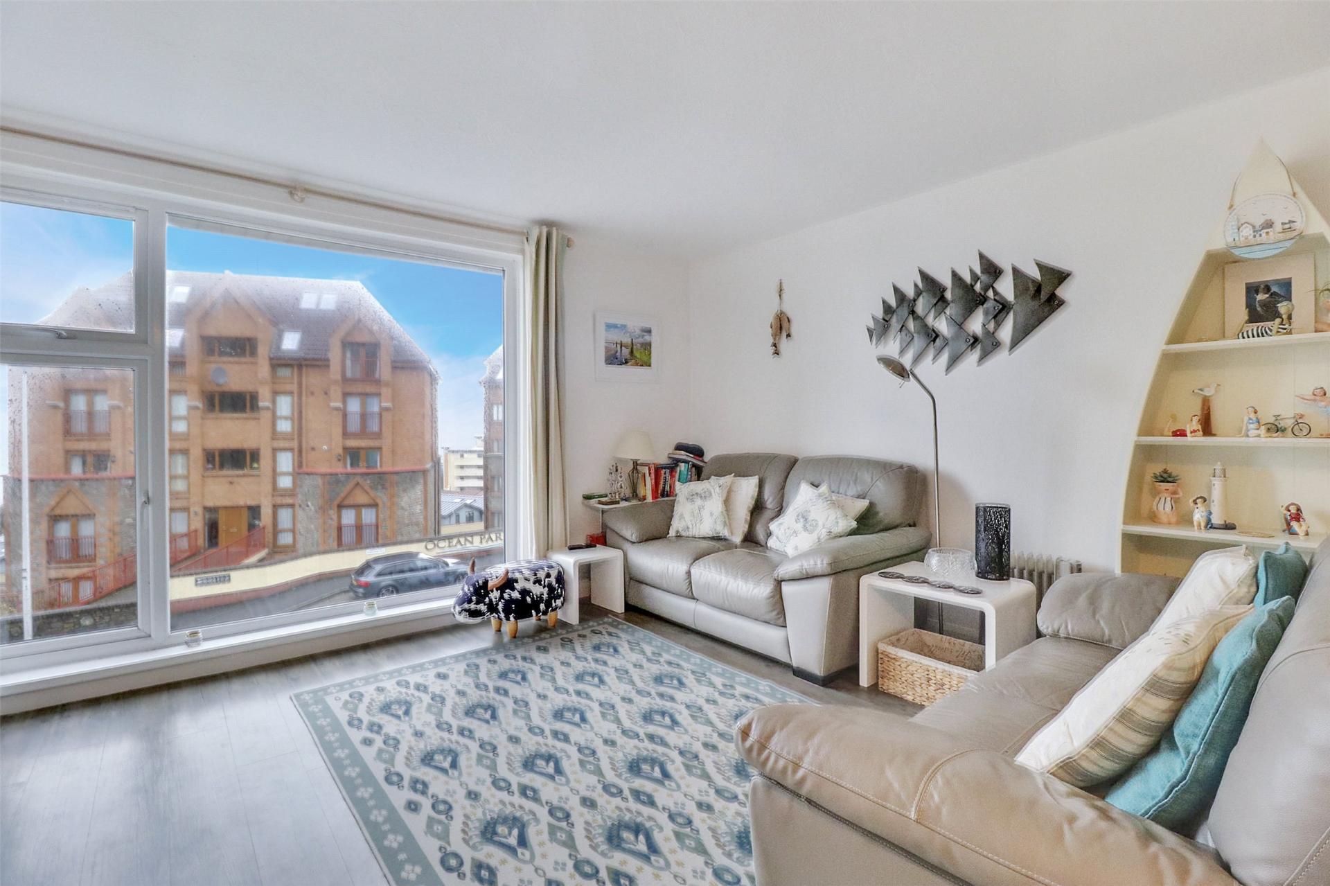 The property is accessed via its own front door to a staircase which leads up to the apartment. At the top of the stairs, a hallway guides you through to a generously sized living room, offering plenty of space for substantial furniture as well as a family dining table and chairs. A large front-facing window fills the room with natural light and enjoys pleasant views towards the nearby sea.