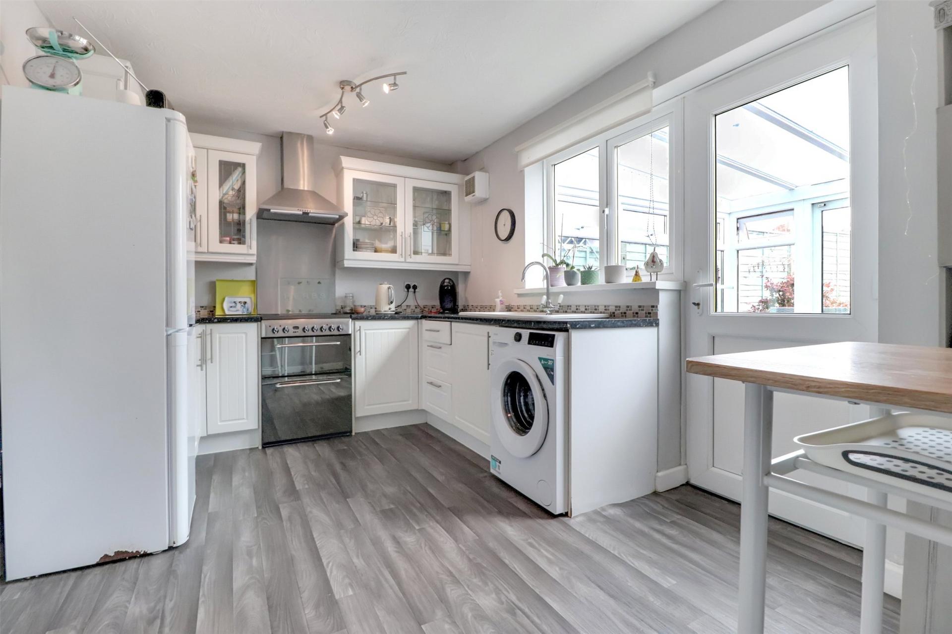 A welcoming entrance hall gives access to the principal ground floor rooms and features stairs rising to the first floor. The living room is a bright and inviting space, with a large front-facing window and useful understairs storage cupboard, ideal for everyday items.