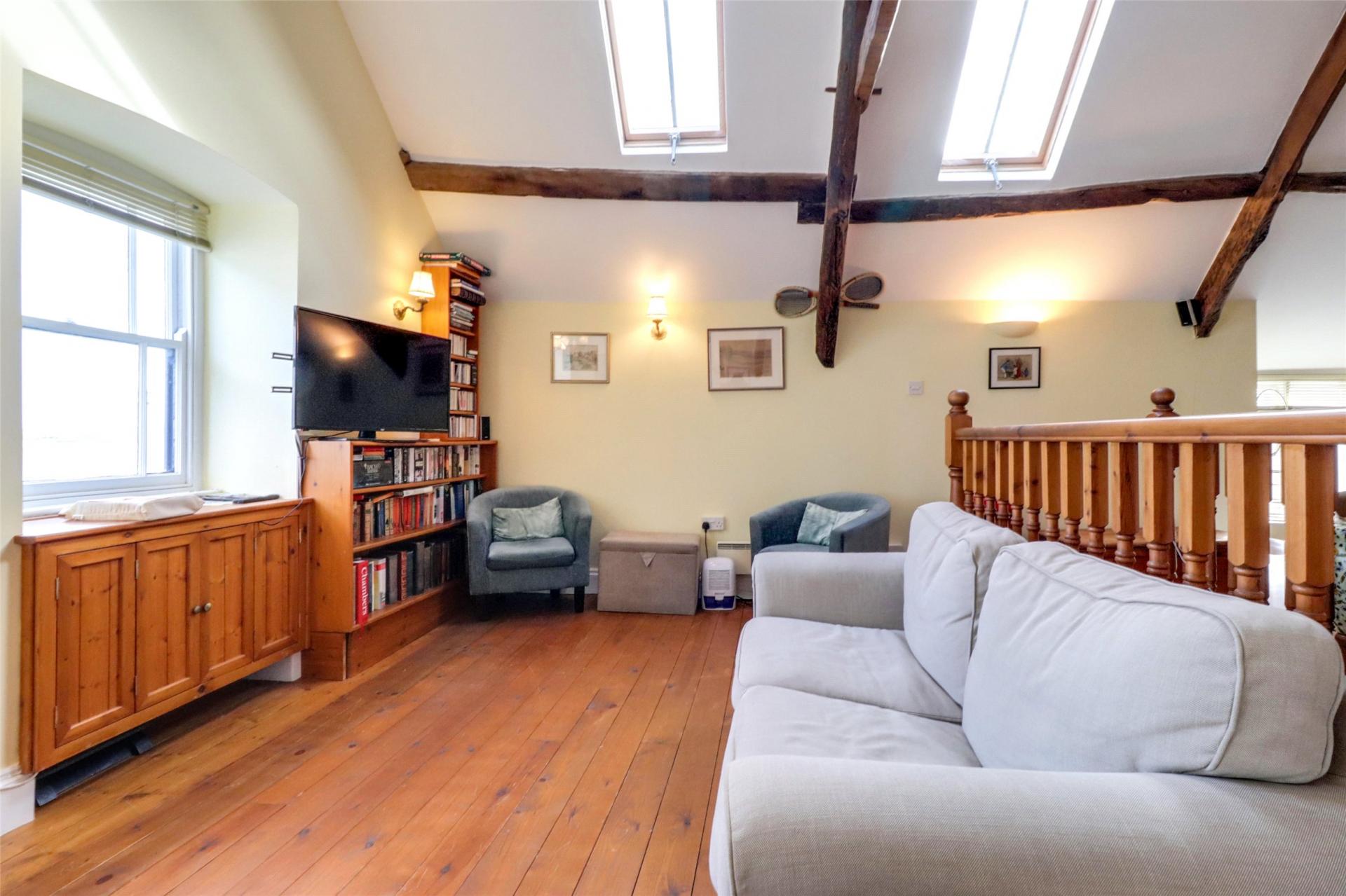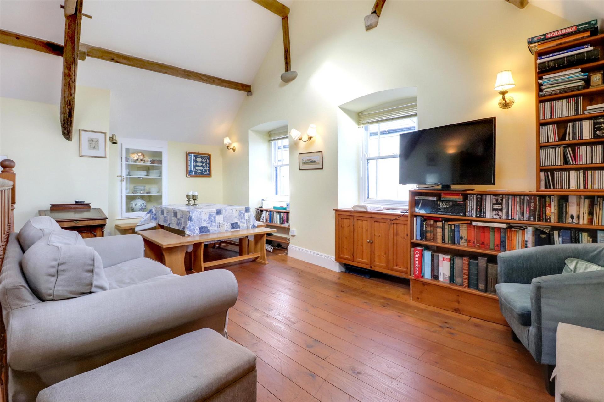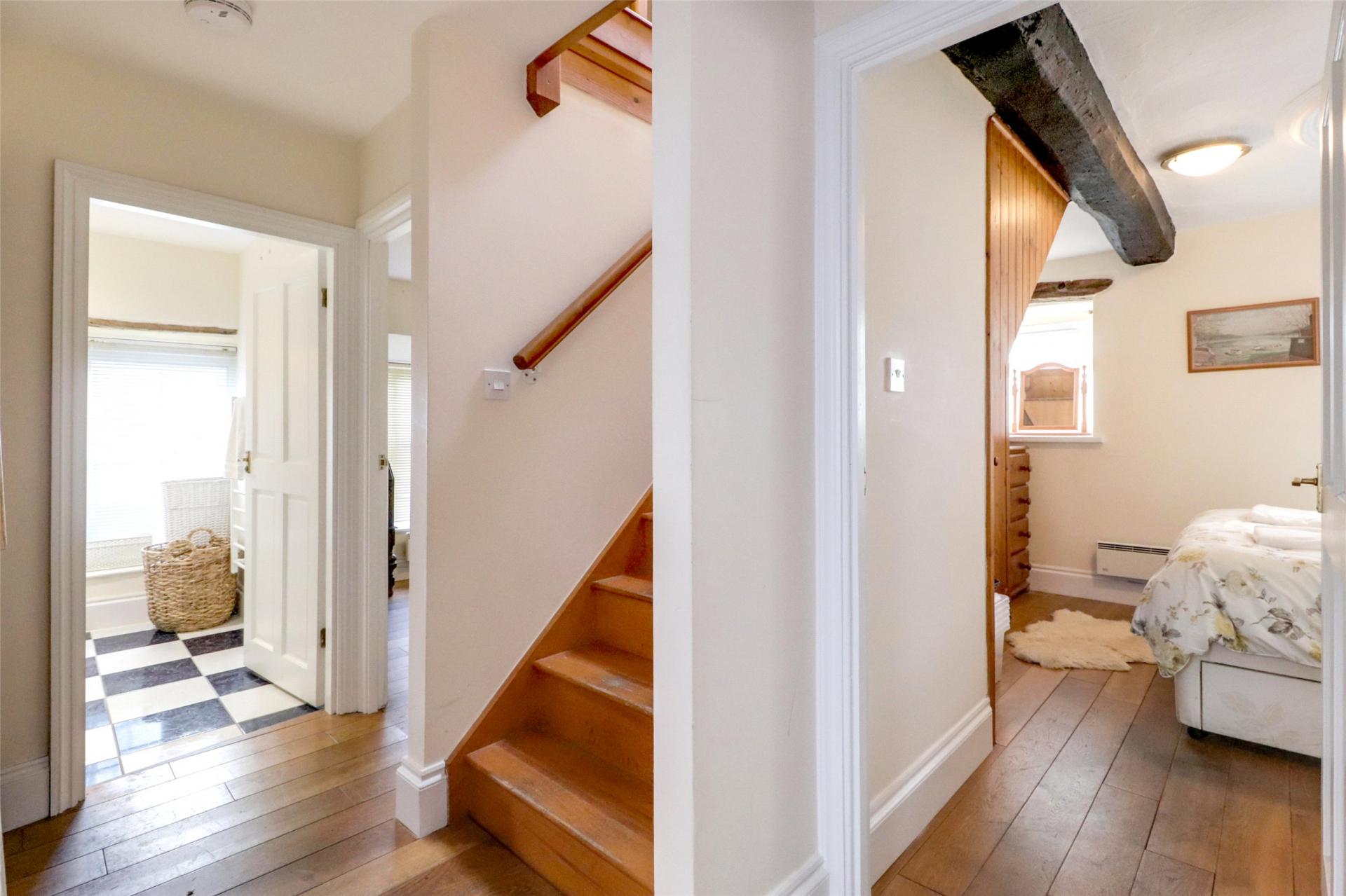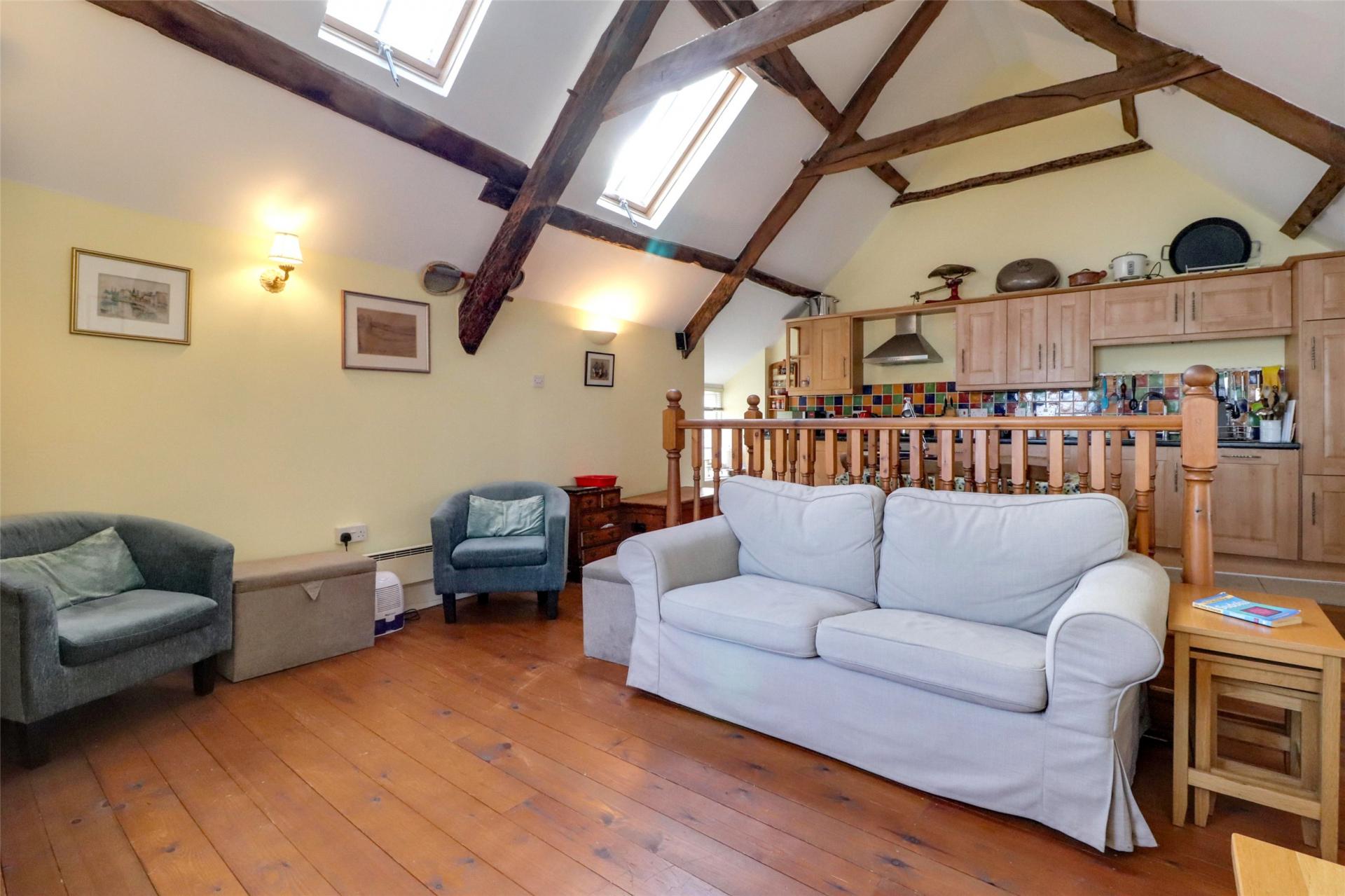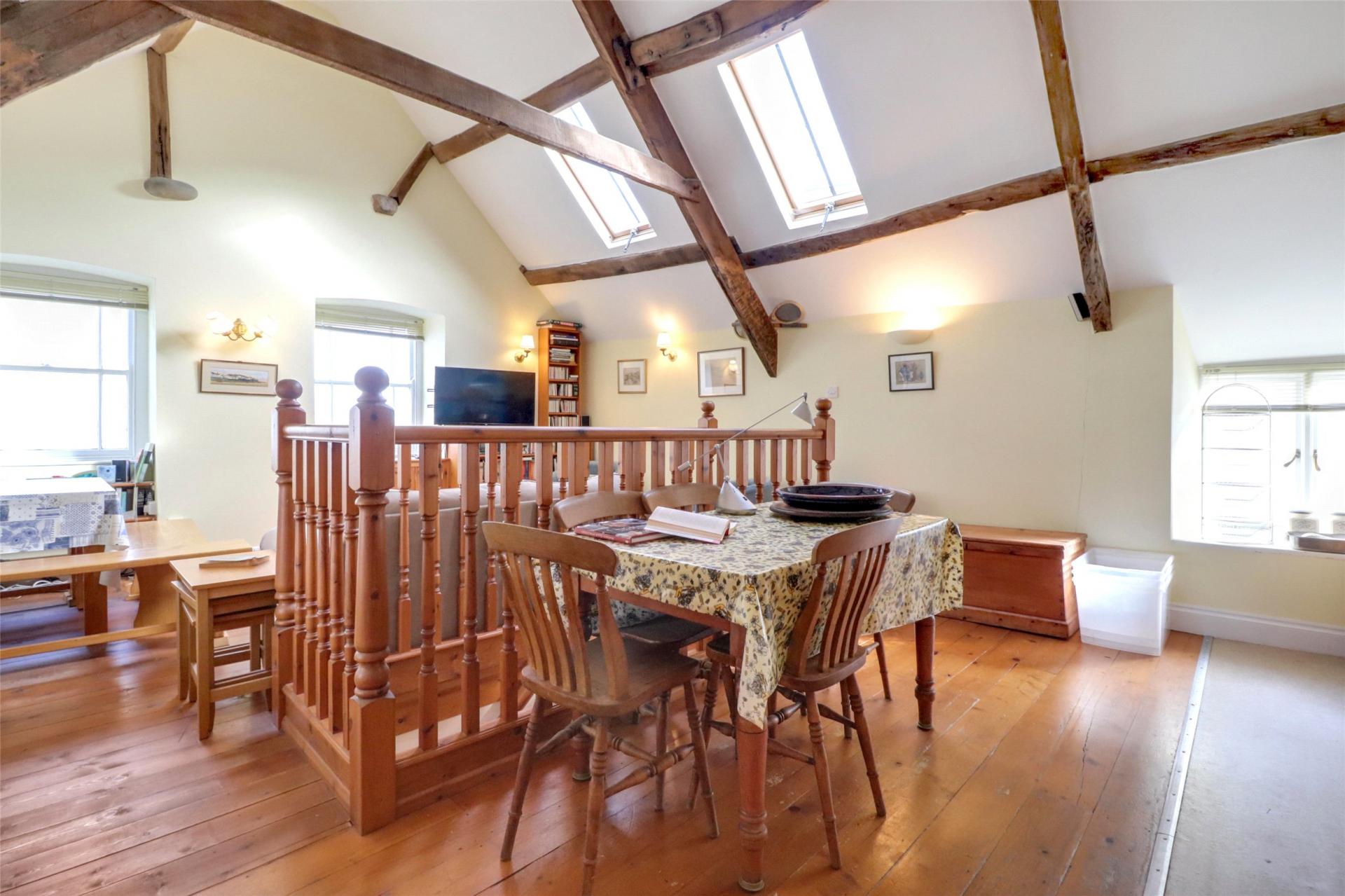 Stairs ascend to the first floor with an open plan living design including an abundance of charm and character thanks to high vaulted ceilings that features exposed wooden beams and floorboards.
