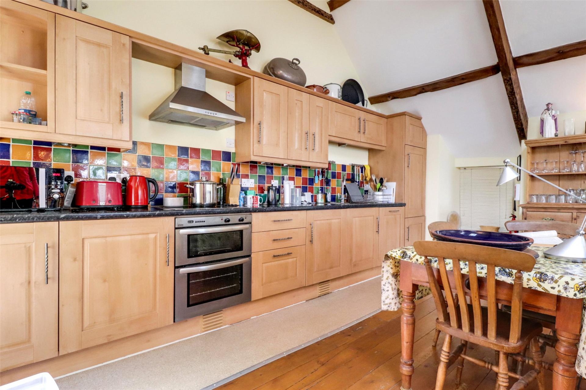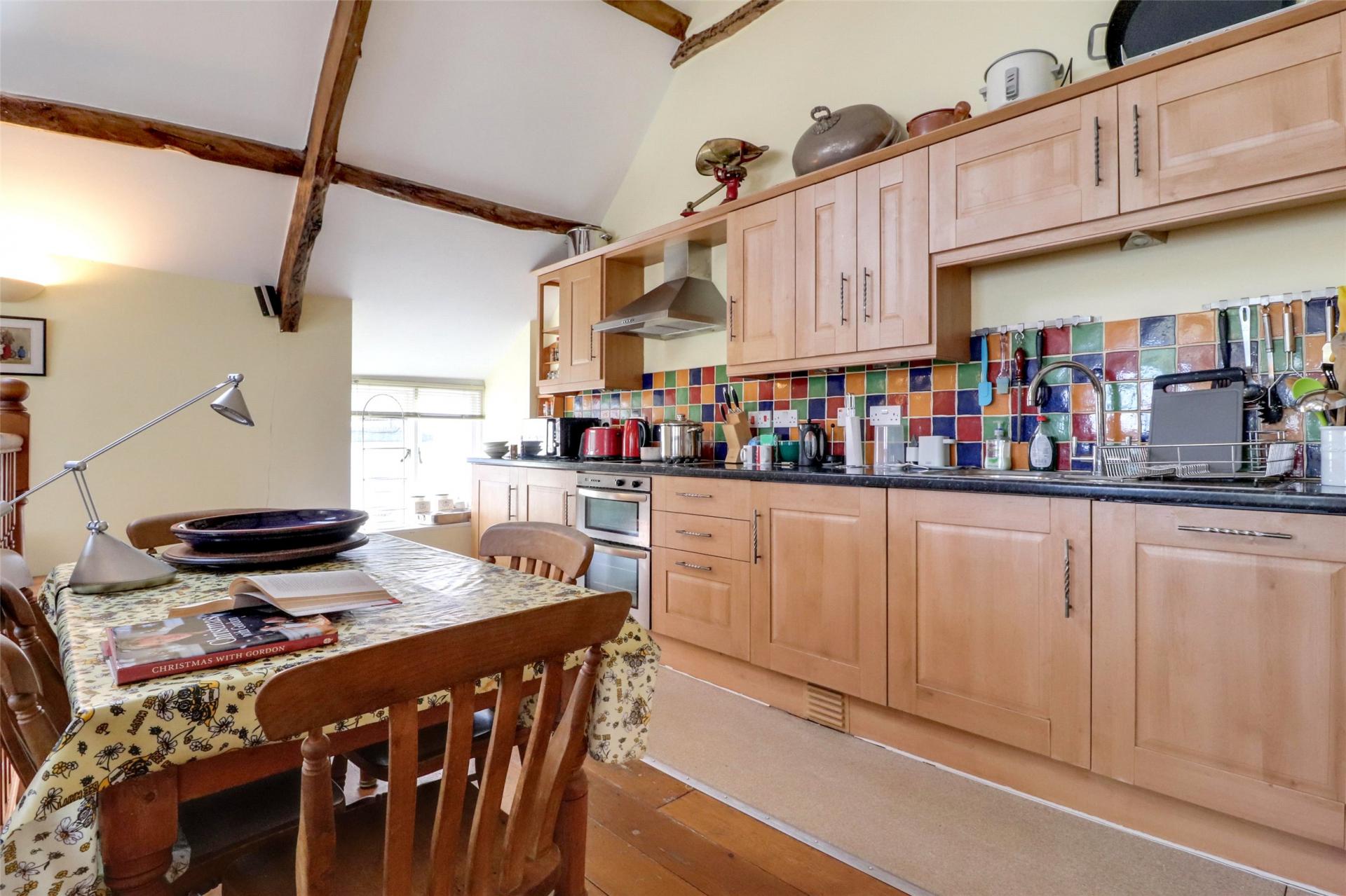 The lounge area offers ample space for seating and is enhanced by a central window that fills the room with natural light, providing stunning riverside views. The kitchen is well-appointed with multiple eye-level and base-level units, an electric oven and hob, and additional space to accommodate a family table and chairs .