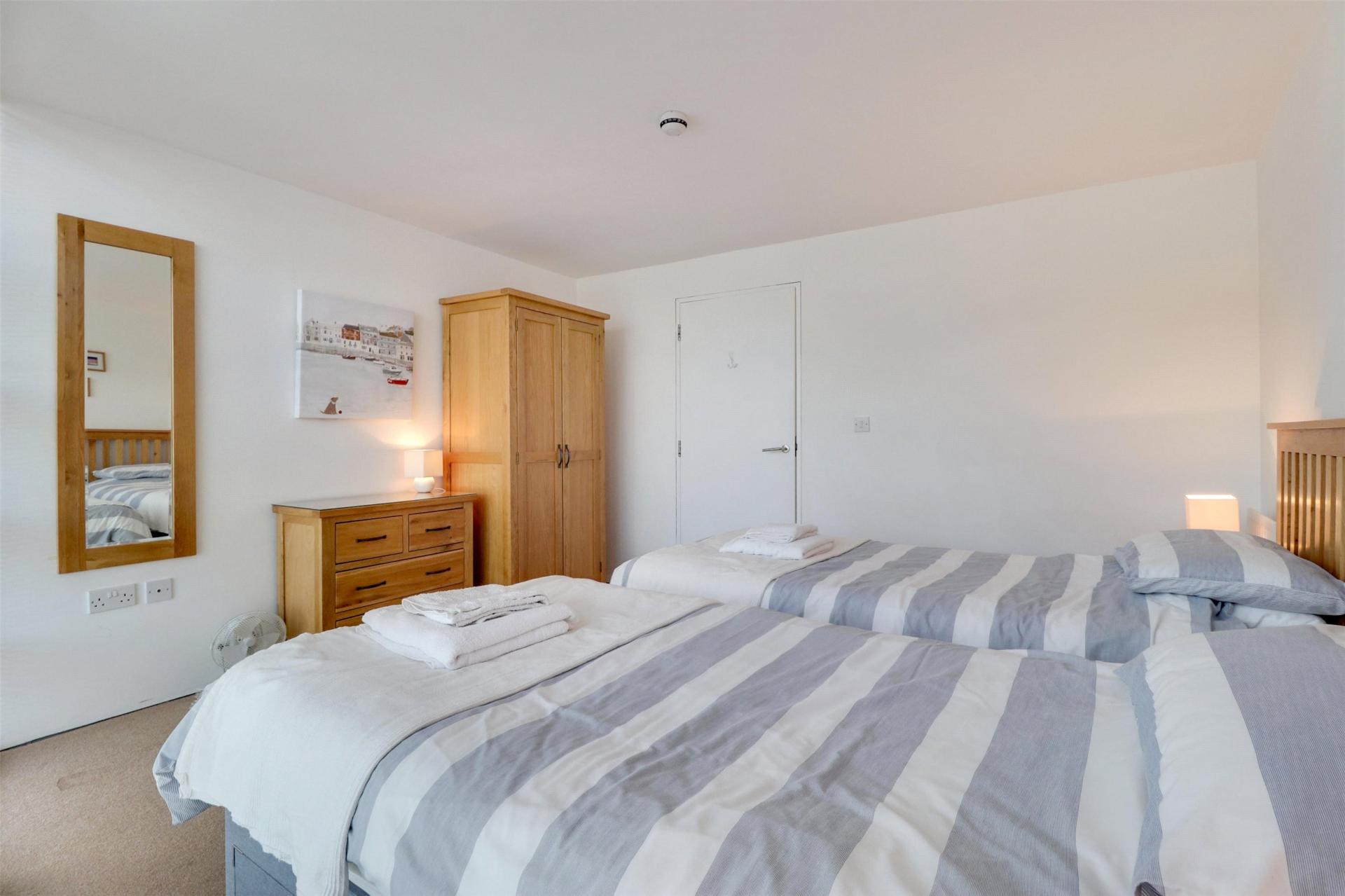 Upon entering the apartment, you are greeted by a welcoming entrance hall with useful built-in storage off the landing and a staircase rising to the main living space. The first-floor boasts two well-proportioned double bedrooms, each designed with comfort in mind. The principal bedroom enjoys its own private balcony, providing a tranquil space to wake up to the sights and sounds of the ocean with en-suite bathroom comprising of WC, wash basin and bath with shower over. A stylish family shower room serves the second bedroom, featuring WC, wash basin and cubicle shower with further space for free standing washing appliances doubling up to be a useful utility room.