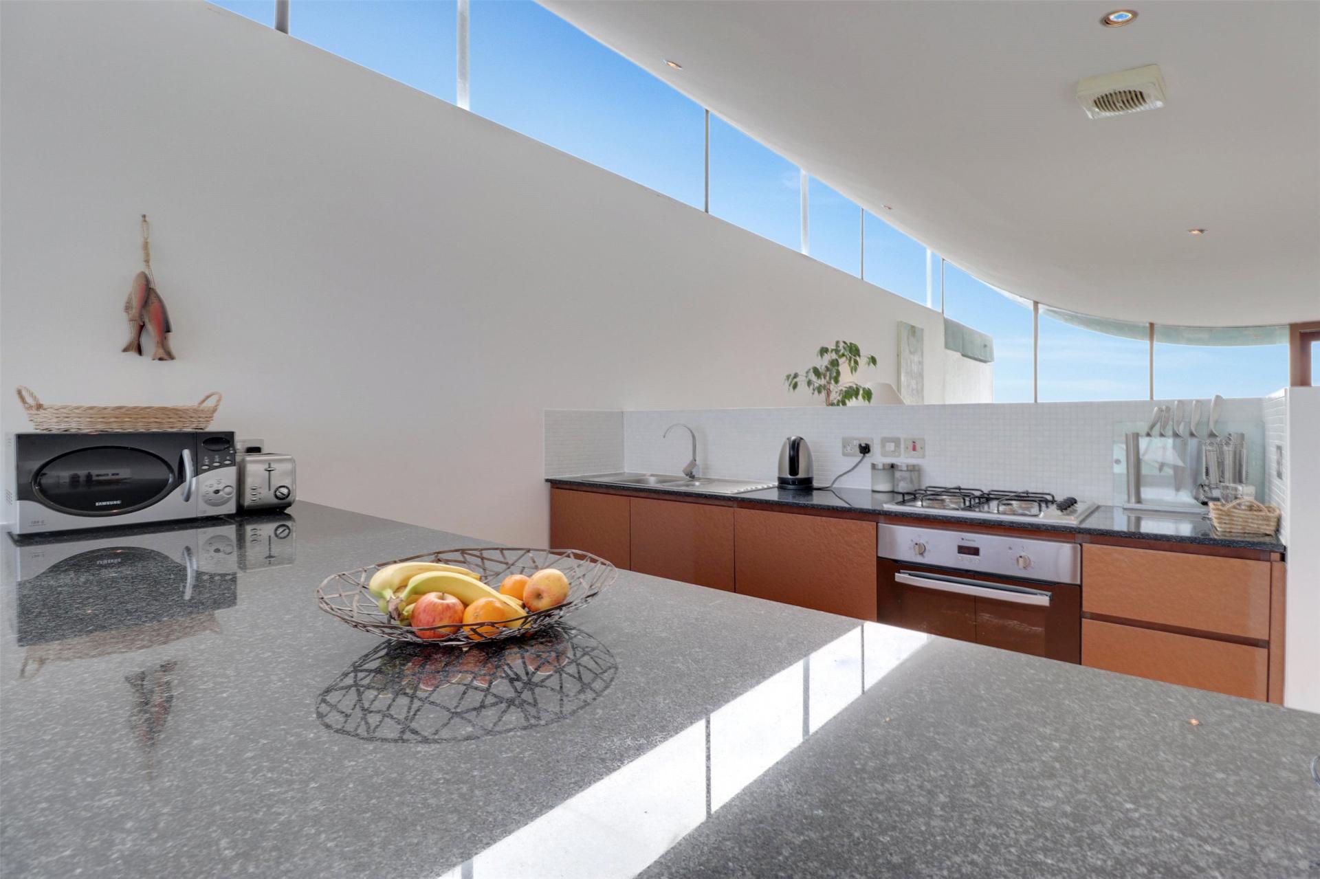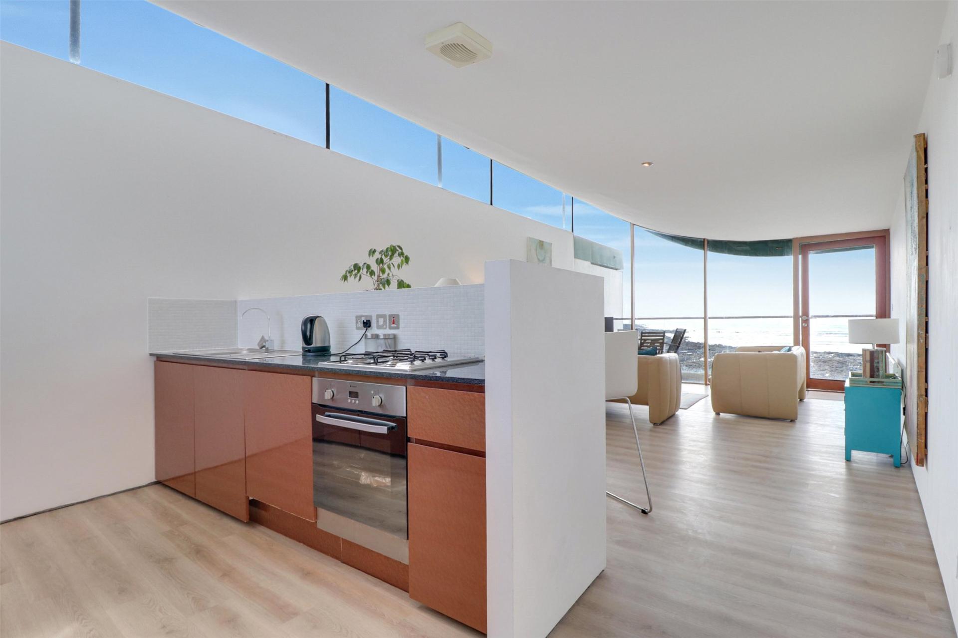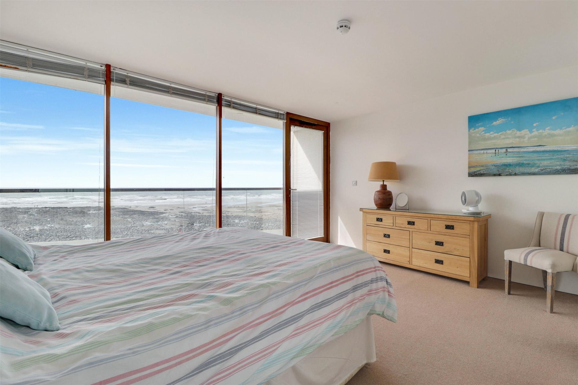 Ascending to the top floor, you enter an impressive open plan living area flooded with natural light from full-height glazing and patio doors leading out onto a spacious balcony. This superb space combines a modern fitted kitchen with integrated appliances, a generous dining area, and a comfortable lounge zone, all oriented to maximise the spectacular coastal outlook across Bideford Bay and the ever-changing Atlantic horizon. Whether entertaining or simply relaxing, this is a truly special setting to savour the views throughout the seasons.
