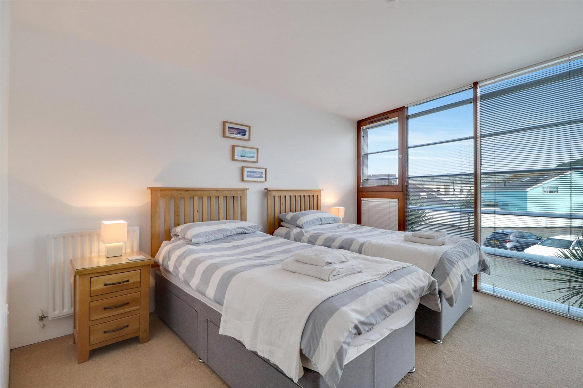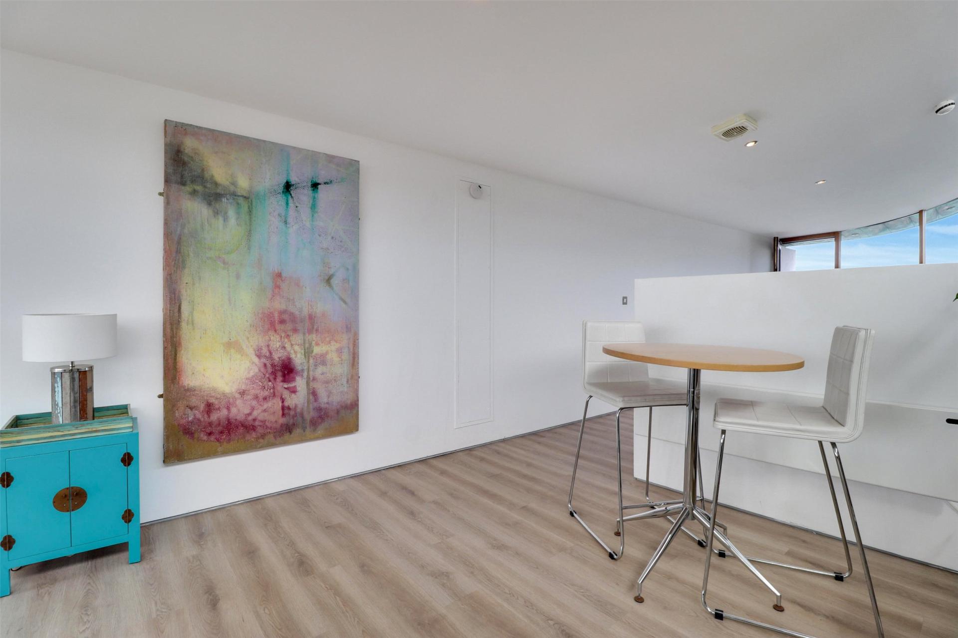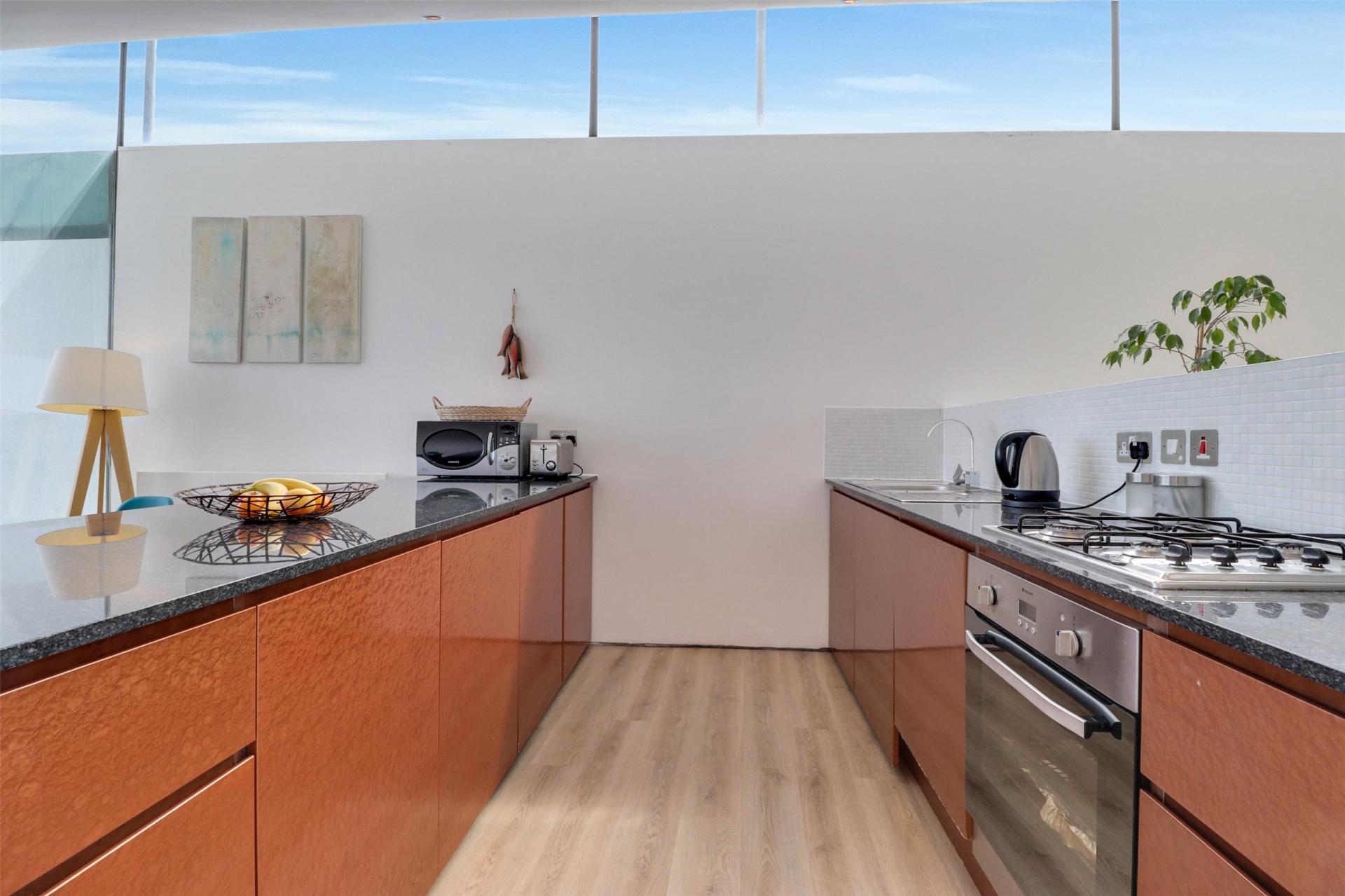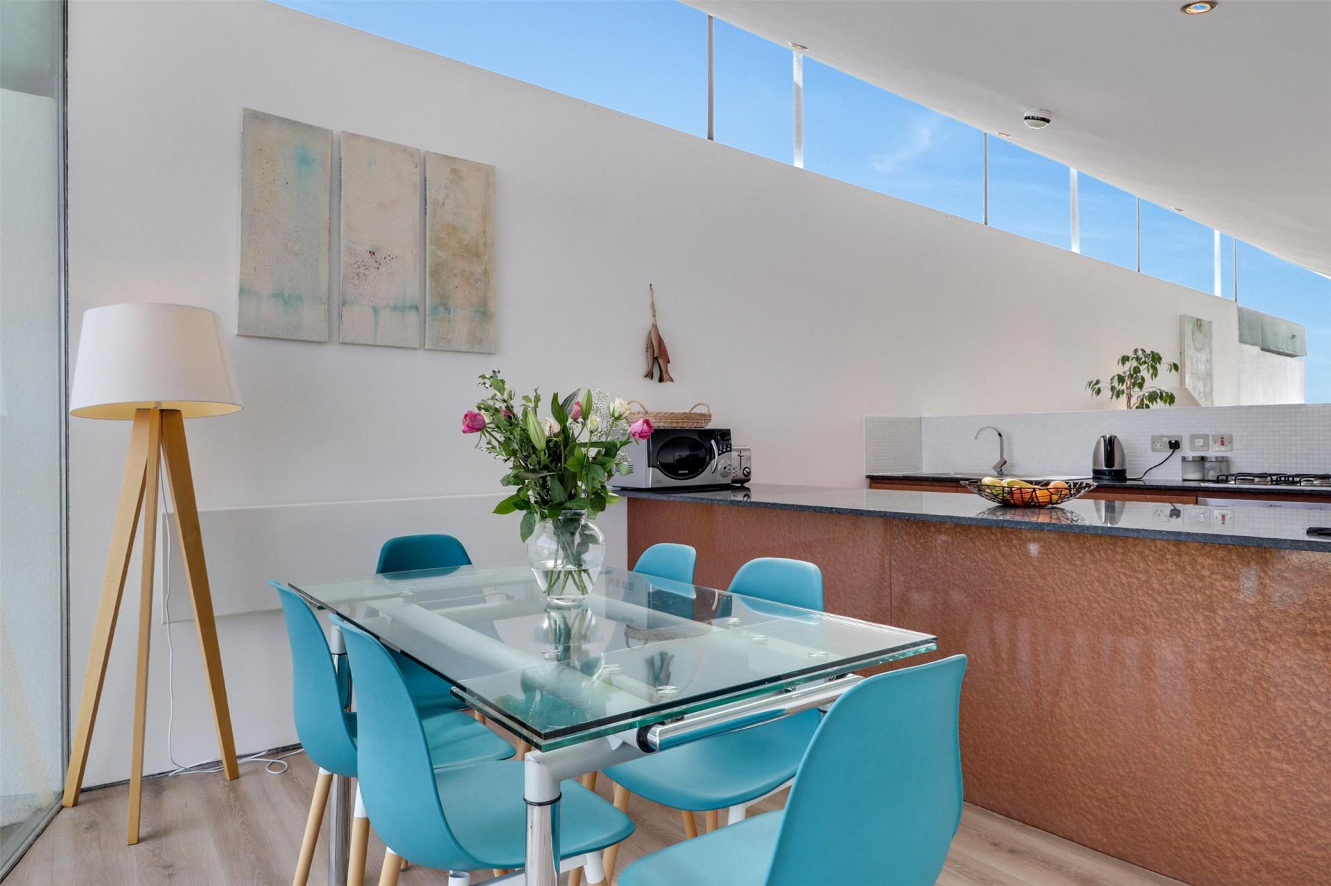 Ascending to the top floor, you enter an impressive open plan living area flooded with natural light from full-height glazing and patio doors leading out onto a spacious balcony. This superb space combines a modern fitted kitchen with integrated appliances, a generous dining area, and a comfortable lounge zone, all oriented to maximise the spectacular coastal outlook across Bideford Bay and the ever-changing Atlantic horizon. Whether entertaining or simply relaxing, this is a truly special setting to savour the views throughout the seasons.