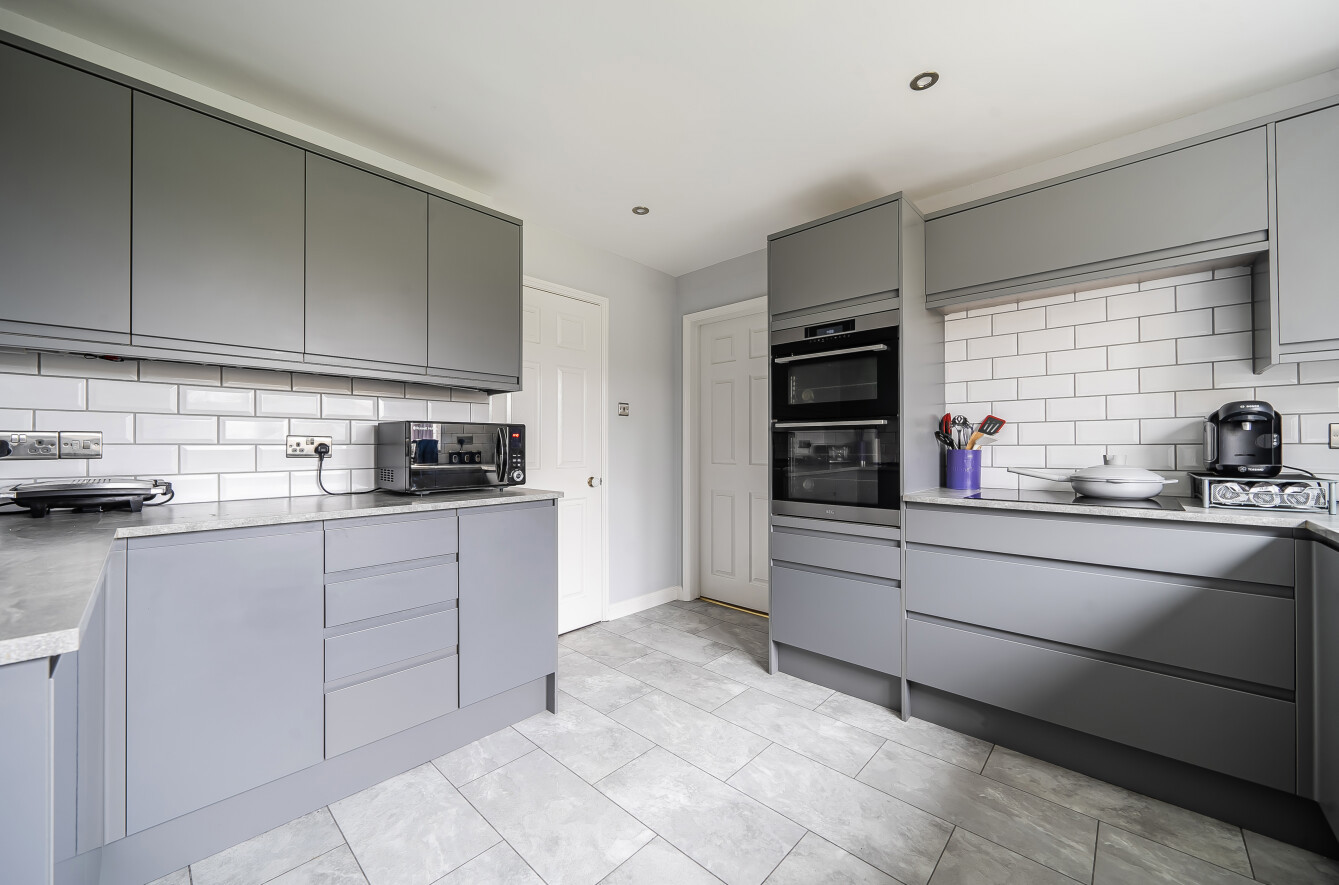 To the rear is a modern fitted kitchen overlooking the attractive garden. The kitchen features a range of eye- and base-level units, incorporating a fitted electric oven, hob with extractor above, and space for freestanding appliances. There is a door that leads to a useful separate utility room, providing space for washing appliances, along with a convenient downstairs WC and additional access to the garden.