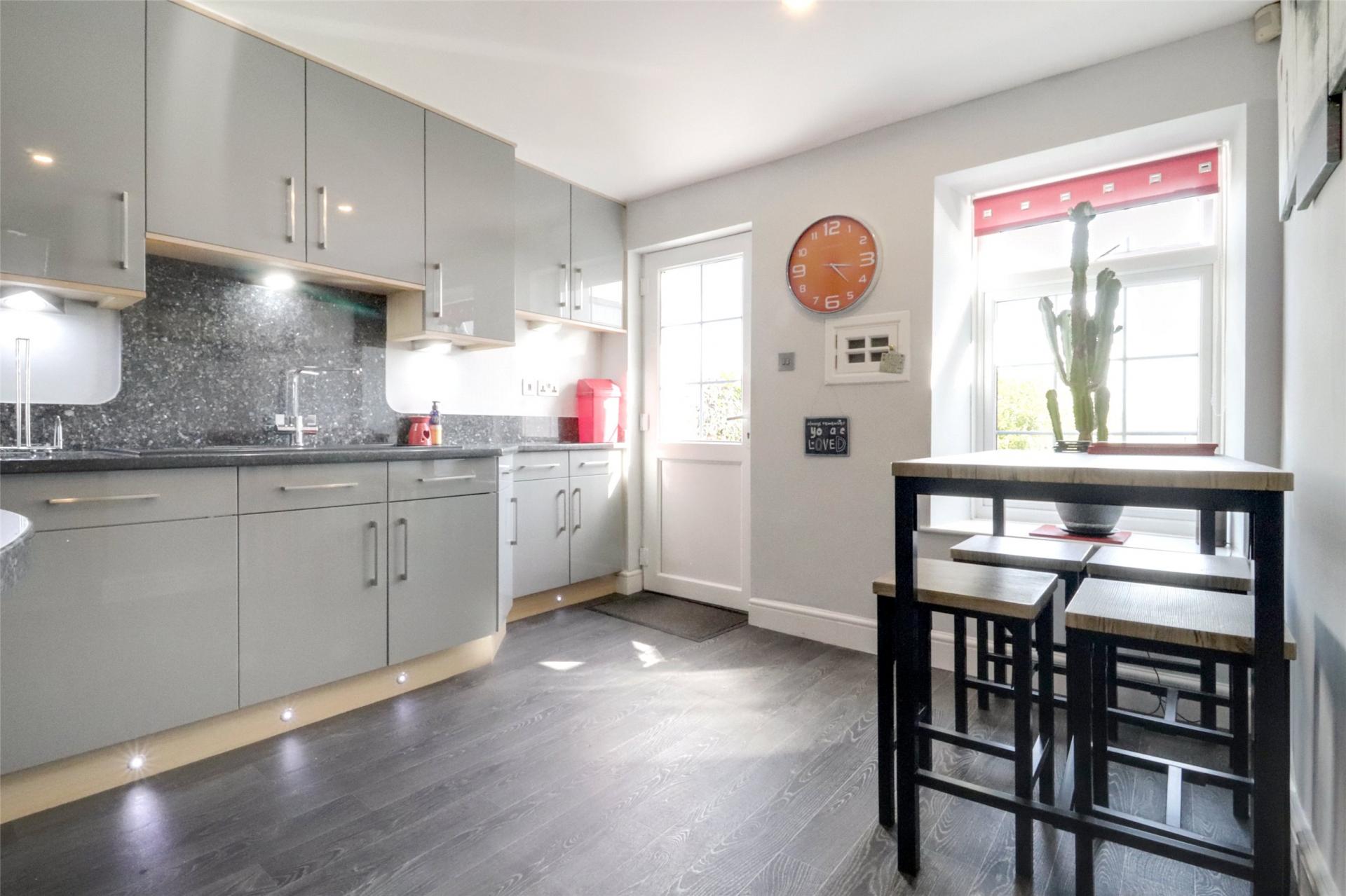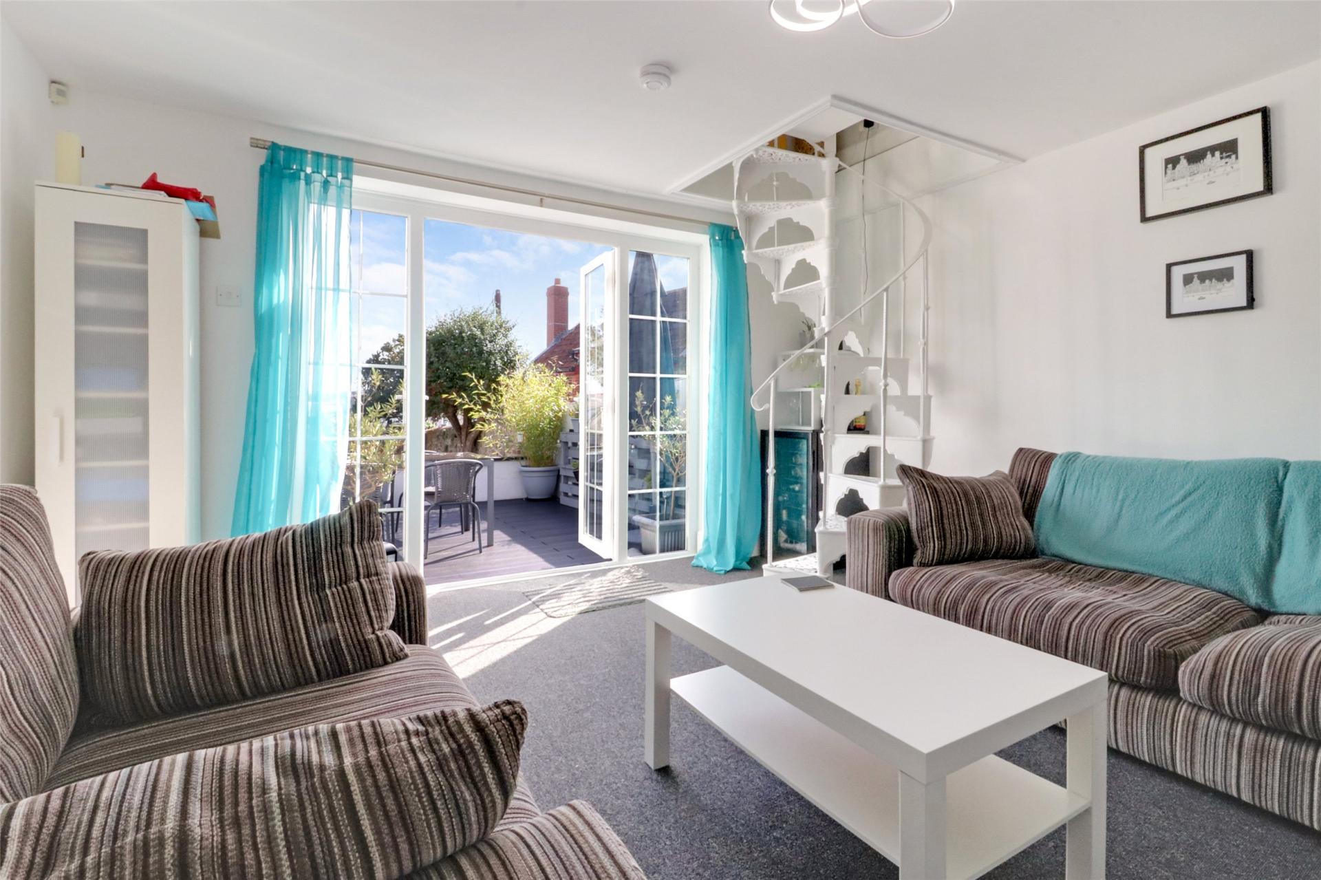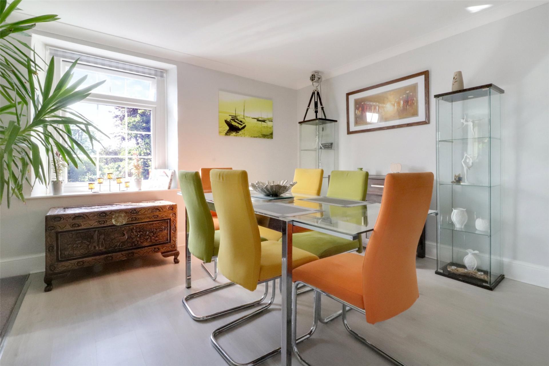 The impressive 30' dual aspect sitting room is a particular feature of the property, with an attractive fireplace with coal effect gas fire and a spiral staircase proceeding down to the garden room underneath. The room affords an abundance of space for a range of large furniture including a formal dining table and chairs. An ideal space for socialising and entertaining with family and friends.