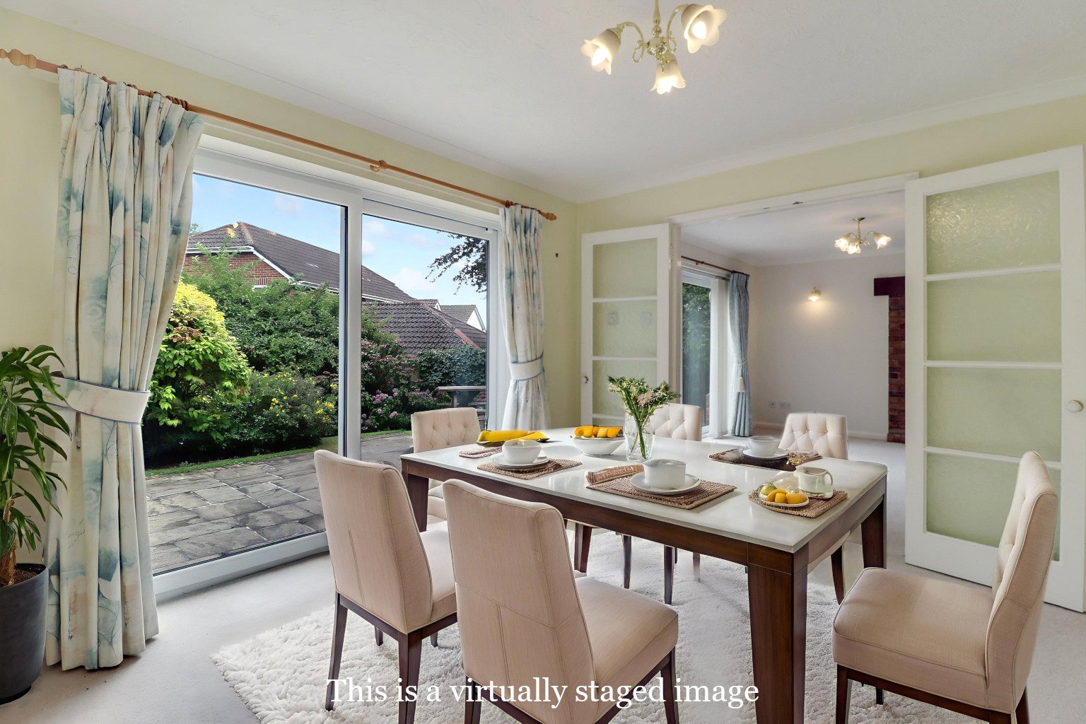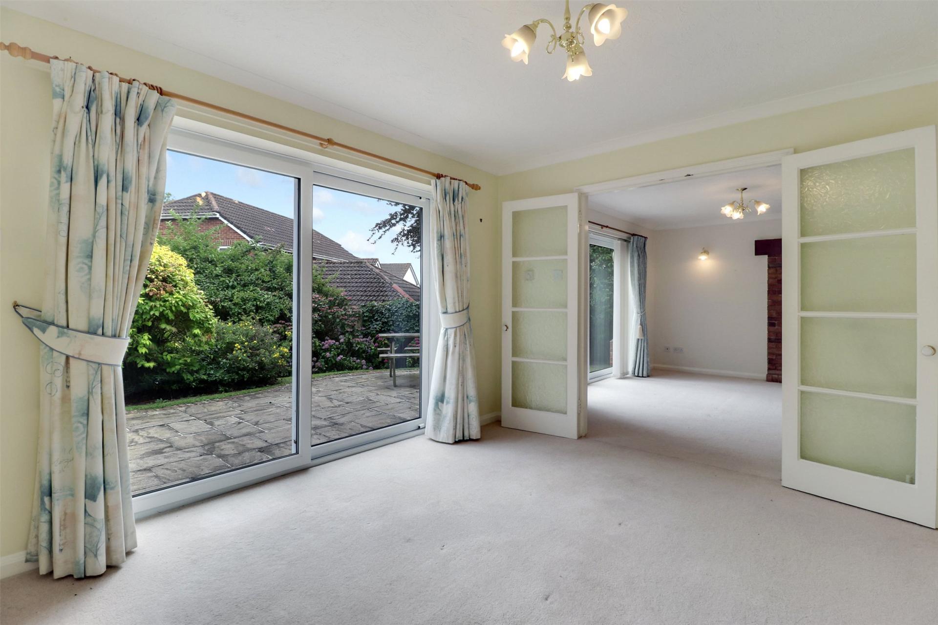 The separate dining room provides an ideal setting for formal entertaining, with patio doors opening onto the garden and internal double doors leading into the lounge. This flexible layout allows the two spaces to combine, creating a larger open-plan area when desired.