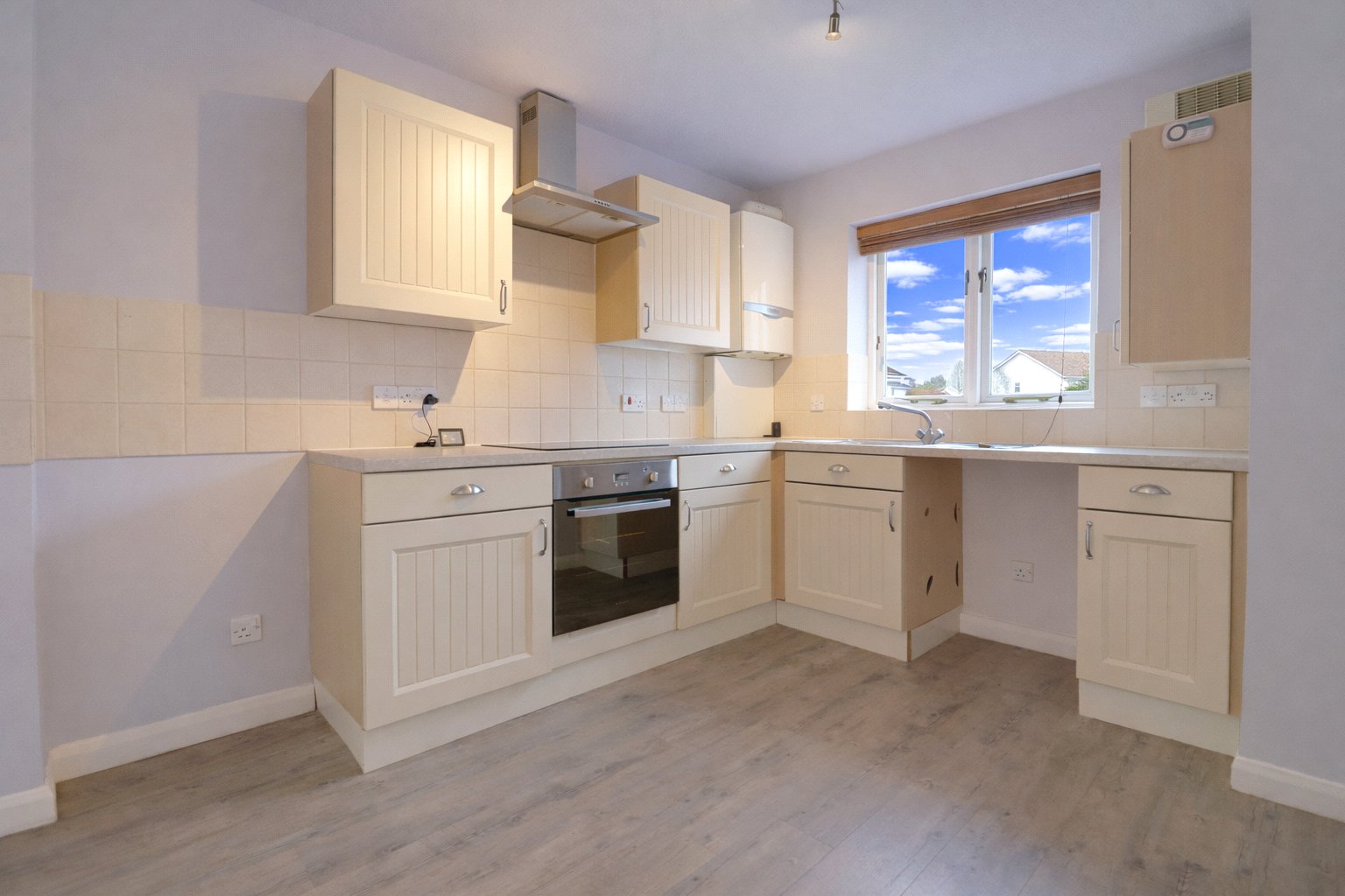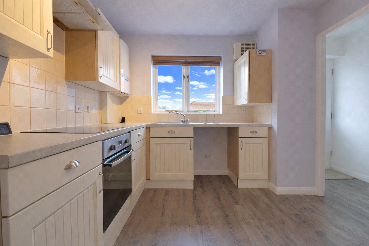 The kitchen is well appointed with a generous range of wall and base units, roll-edge work surfaces and tiled splashbacks. An inset stainless steel sink with mixer tap and drainer is complemented by an integrated electric oven with induction hob and stainless steel extractor hood. There is additional space and plumbing for further appliances, along with ample room for a breakfast table, creating a practical and sociable space.
